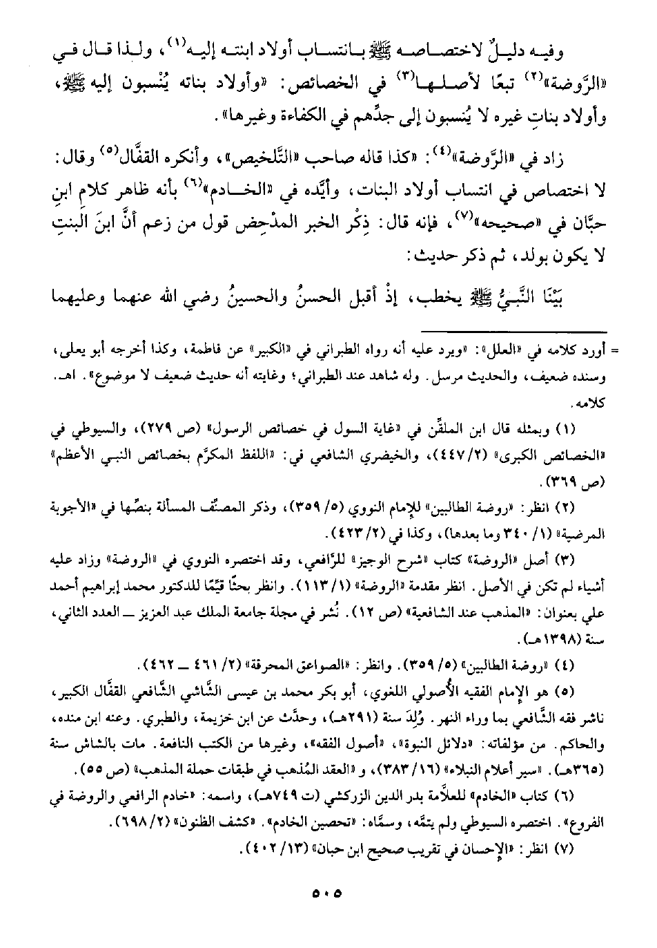 وفيه دليل لاختصاصه -صلى الله عليه وسلم- بانتساب أولاد ابنته إليه (¬١)، ولذا قال في "الرَّوضة" (¬٢) تبعًا لأصلها (¬٣) في الخصائص: "وأولاد بناته يُنْسبون إليه -صلى الله عليه وسلم-، وأولاد بناتِ غيره لا يُنسبون إلى جدهم في الكفاءة وغيرها"،