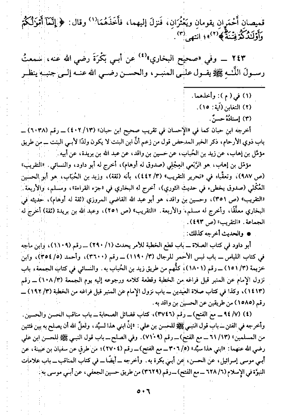 ٢٤٣ - وفي "صحيح البخاري" (¬٤) عن أبي بَكْرَةَ رضي الله عنه، سمعتُ رسولَ اللهِ -صلى الله عليه وسلم- يقول على المنبر، والحسن رضي الله عنه إلى جنبه ينظر