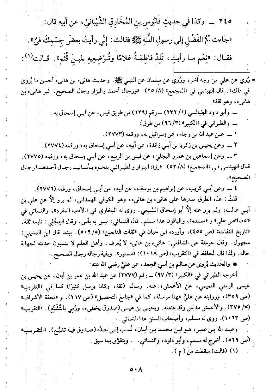 ٤ - وعن أبي كريب، عن إبراهيم بن يوسف، عن أبيه، عن أبي إسحاق، ورقمه (٢٧٧٦). قلتُ: هذه الطرق مدارها على هانئ بن هانئ، وهو الكوفي الهمداني، لم يرو إلَّا عن علي بن أبي طالب، ولم يرو عنه إلَّا أبو إسحاق السَّبيعي. روى له البخاري في "الأدب المفرد"، والنسائي في "خصائص علي" و"مسنده"، والباقون عدا سلم. قال النسائي: ليس به بأس. وقال العِجْلِي: تابعه ثقة. "تاريخ الثقات" (ص ٤٥٥)، وأورده ابن حبان في "ثقات التابعين" (٥/ ٥٠٩). بينما قال ابن المديني: مجهول. وقال حرملة عن الشافعي: هانئ بن هانئ لا يُعرف. وأهل العلم لا ينسبون حديثه لجهالة حاله. ولذا قال الحافظ في "التقريب" (ص ١٠١٨): "مستور". وبقية رجاله رجال الصحيح.