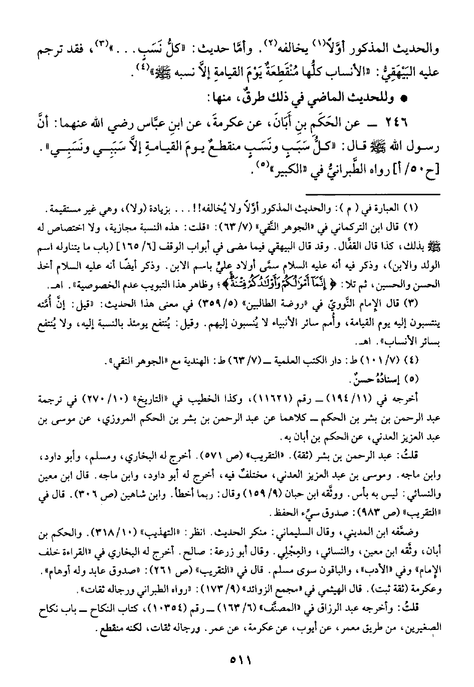٢٤٦ - عن الحَكَمِ بنِ أَبَانَ، عن عكرمةَ، عن ابنِ عبَّاس رضي الله عنهما: أن رسول الله -صلى الله عليه وسلم- قال: "كُلُّ سَبَبٍ ونَسَبٍ منقطعٌ يومَ القيامةِ إلَّا سَبَبي ونَسَبي". رواه الطَّبرانيُّ في "الكبير" (¬٥).