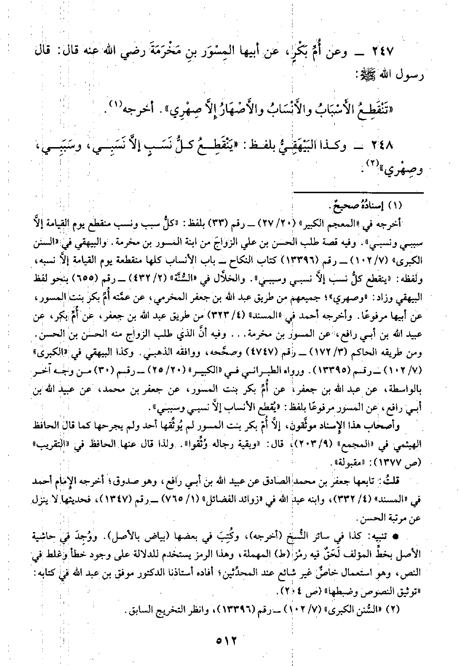 ٢٤٨ - وكذا البَيْهَقِيُّ بلفظ: "يَنْقَطِعُ كلُّ نَسَبٍ إلَّا نَسَبِي، وسَبَبِي، وصهْري" (¬٢).