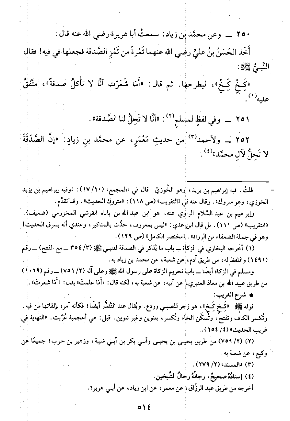 "كَخٍ كَخٍ"، ليطرحها. ثم قال: "أَمَا شَعَرْت أنَّا لا نأْكلُ صدقةً"، متَّفقٌ عليه (¬١).
