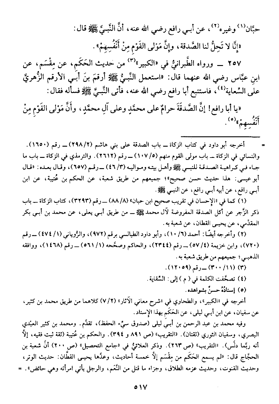 "يا أبا رافع! إنَّ الصَّدقَةَ حرامٌ على محمَّدٍ وعلى آلِ محمدٍ، وأَنَّ مَوْلى القَوْمِ مِنْ أَنْفُسِهِمْ" (¬٥).
