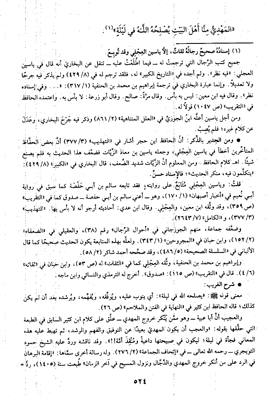 والعجيب أن أبا عبية -وهو ممَّن يُنْكر خروج المهدي- علَّق على كلام ابن كثير السابق في الطبعة التي حقَّقها بقوله: "والعجب أن يكون المهديّ بعيدًا عن التوفيق والفهم والرشد، ثم تهبط عليه هذه المعاني فجأة في ليلة؛ ليكون في صبيحتها داعيةً ومُنْقِذَ أُمَّة! ! ". وفد ناقشه وردَّ عليه الشيخ حمود التويجري -رحمه الله تعالى- في "إتحاف الجماعة" (٢/ ٢٧٦). وله رسالة أخرى سمَّاها: "إقامة الرهان في الرد على من أنكر خروج المهدي والدَّجَّال ونزول المسيح في آخر الزمان" طُبعت سنة (١٤٠٥)، ردَّ =