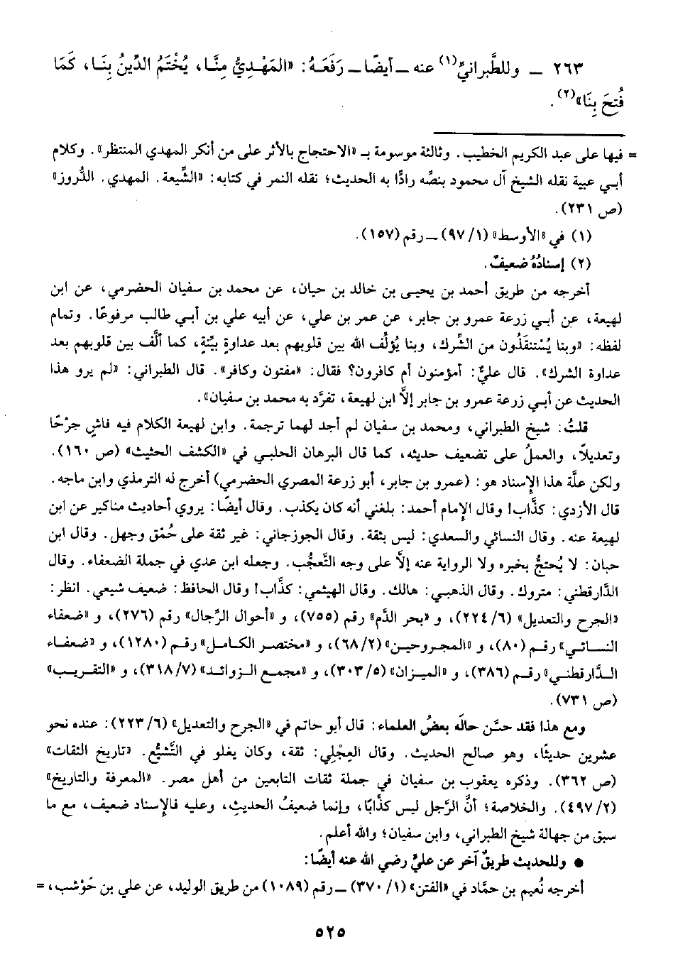 ٢٦٣ - وللطَّبرانيِّ (¬١) عنه -أيضًا- رَفَعَهُ: "المَهْدِيُّ مِنَّا، يُخْتَمُ الدِّينُ بِنَا، كَمَا فُتِحَ بِنَا" (¬٢).