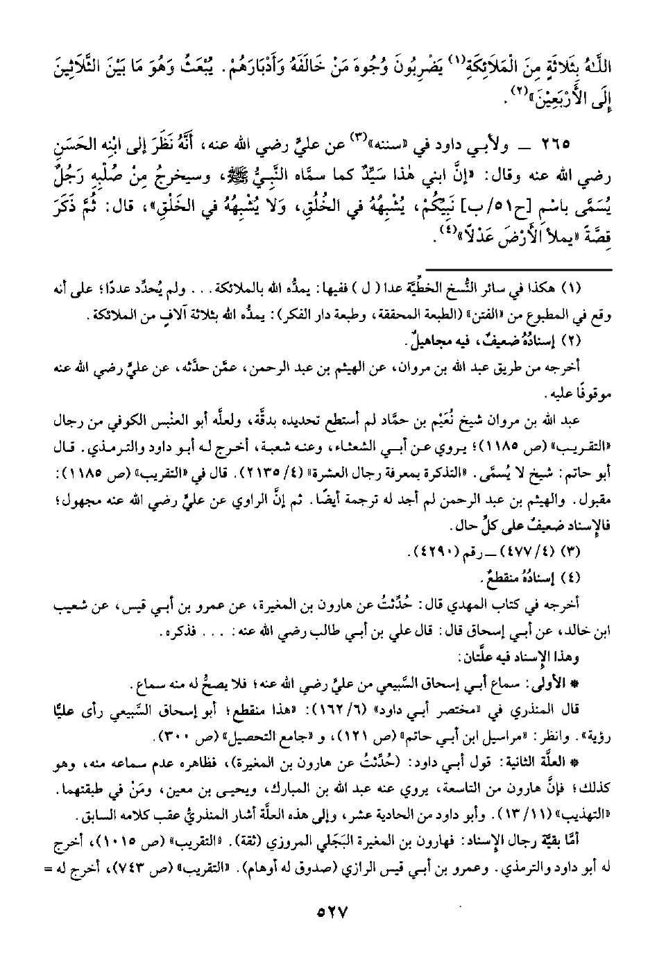 ٢٦٥ - ولأبي داود في "سننه" (¬٣) عن عليٍّ رضي الله عنه، أَنَّهُ نَظَرَ إلى ابْنِه الحَسَنِ رضي الله عنه وقال: "إِنَّ ابني هذا سَيِّدٌ كما سمَّاه النَّبِيُّ -صلى الله عليه وسلم-، وسيخرجُ مِنْ صُلْبِهِ رَجُلٌ يُسَمَّى باسْمِ نَبيِّكُمْ، يُشْبِهُهُ في الخُلُقِ، وَلا يُشْبِهُهُ في الخَلْقِ"، قال: ثُمَّ ذَكَرَ قِصَّةً "يملأَ الأَرْضَ عَدْلًا" (¬٤).