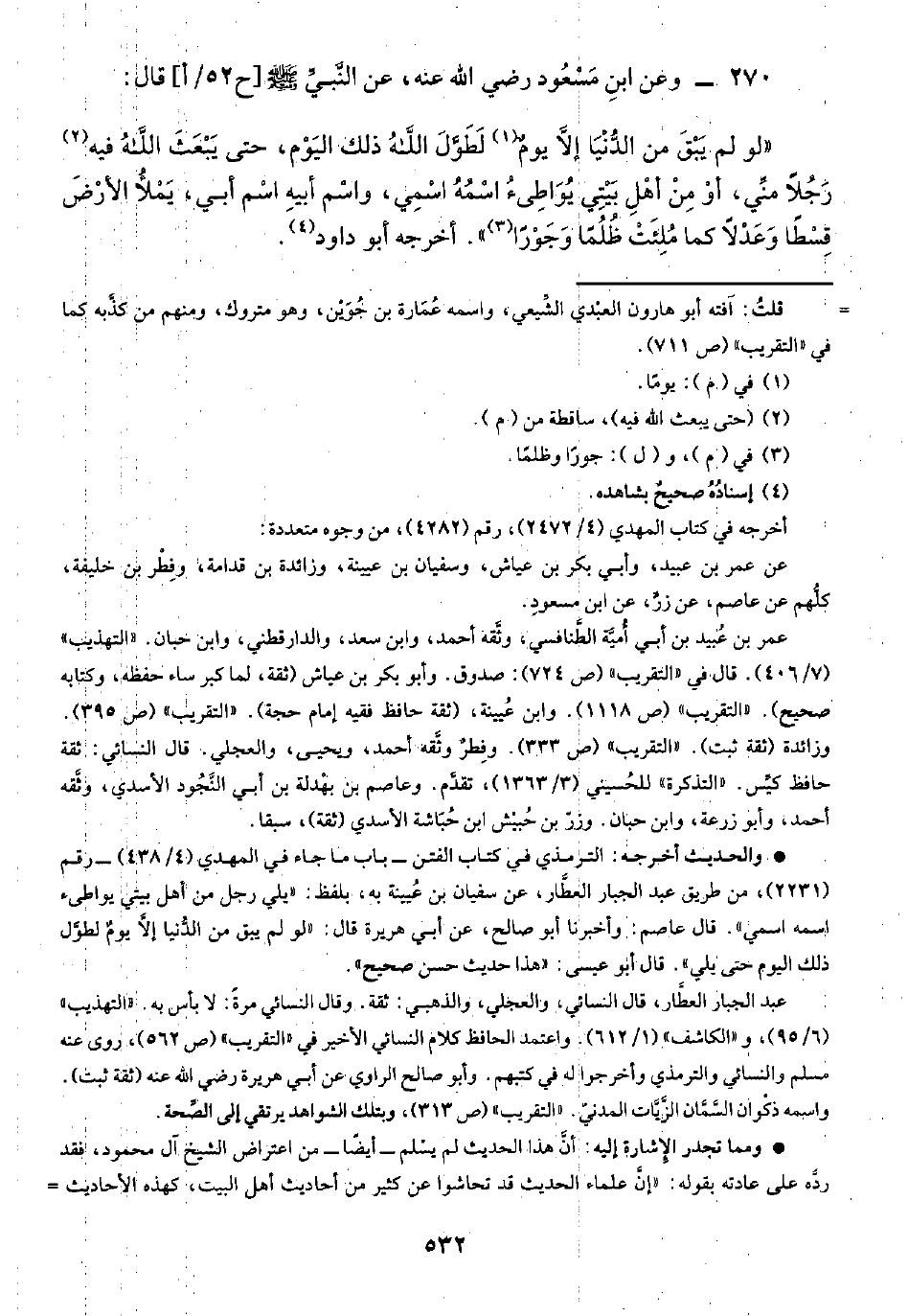 • والحديث أخرجه. الترمذي في كتاب الفتن - باب ما جاء في المهدي (٤/ ٤٣٨) - رقم (٢٢٣١)، من طريق عبد الجبار العطَّار، عن سفيان بن عُيينة به، بلفظ: "يلي رجل من أهل بيتي يواطئ اسمه اسمي". قال عاصم: وأخبرنا أبو صالح، عن أبي هريرة قال: "لو لم يبق من الدُّنيا إلَّا يومٌ لطوَّل ذلك اليوم حتى يلي". قال أبو عيسى: "هذا حديث حسن صحيح".