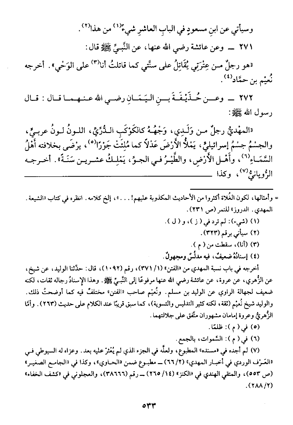 أخرجه في باب نسبة المهدي من "الفتن" (١/ ٣٧١)، رقم (١٠٩٢)، قال: حدَّثنا الوليد، عن شيخ، عن الزُّهري، عن عروة، عن عائشة رضي الله عنها مرفوعًا إلى النَّبيِّ -صلى الله عليه وسلم-. وهذا الإسنادُ رجاله ثقات، لكنه ضعيف لجهالة الراوي عن الوليد بن مسلم. ونُعيم صاحب "الفتن" مختلفٌ فيه كما أوضحتُ ذلك. والوليد شيخ نُعيم (ثقة، لكنه في التدليس والتسوية)، كما سبق قريبًا عند الكلام على حديث (٢٦٣). وأَمَّا الزُّهريُّ وعروة إمامان مشهوران متَّفق على جلالتهما.