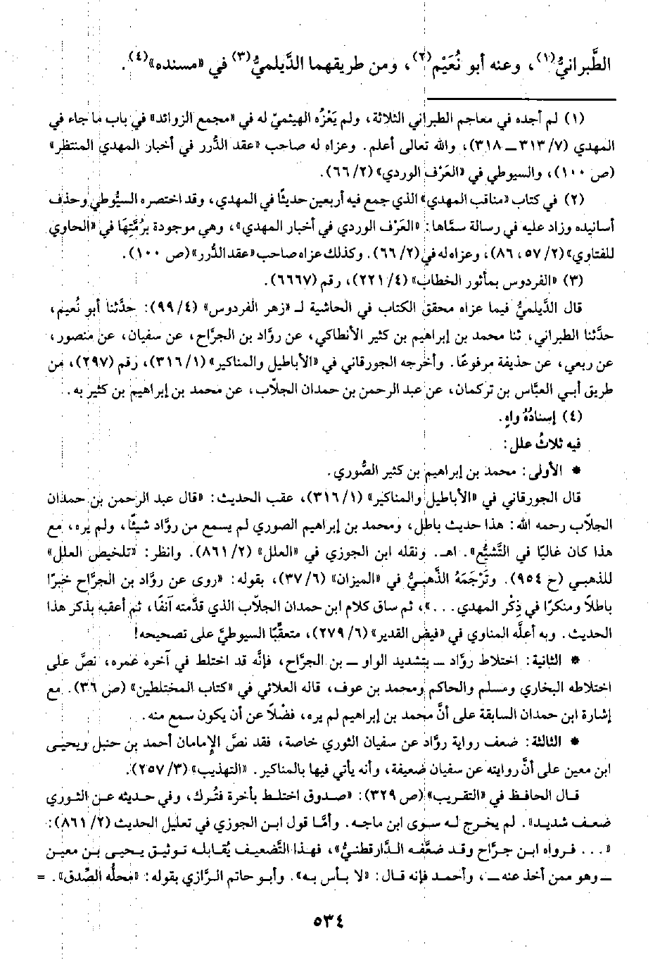 (¬٢) في كتاب "مناقب المهدي" الذي جمع في أربعين حديثًا في المهدي، وقد اختصره السيُّوطي وحذف أسانيده وزاد عليه في رسالة سمَّاها: "العَرْف الوردي في أخبار المهدي"، وهي موجودة برُمَّتِهَا في "الحاوي للفتاوي" (٢/ ٥٧، ٨٦)، وعزاه له في (٢/ ٦٦). وكذلك عزاه صاحب "عقد الدُّرر" (ص ١٠٠).