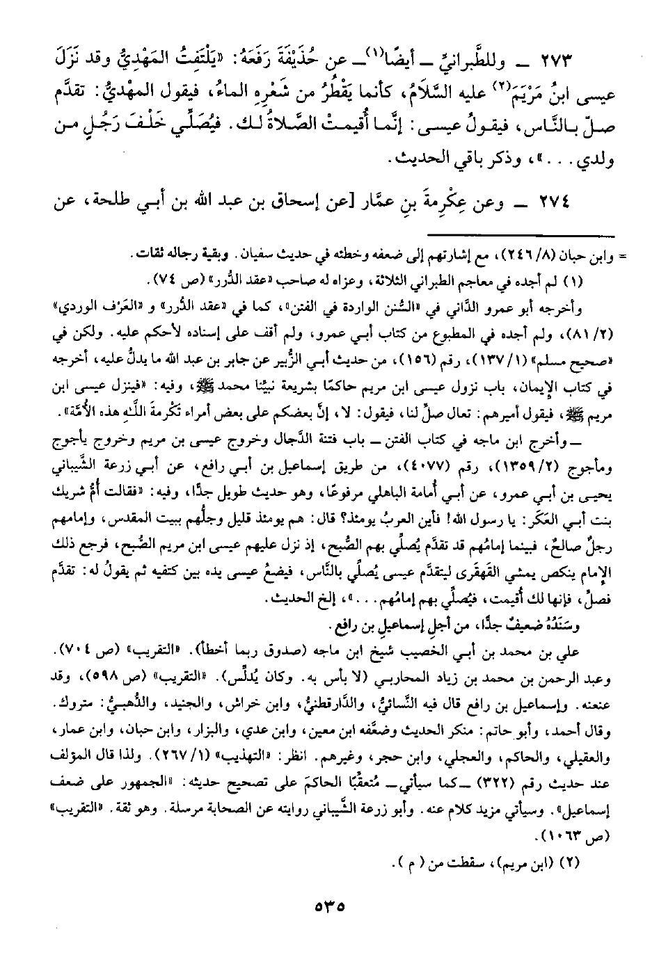 ٢٧٣ - وللطَّبرانيِّ -أيضًا (¬١) - عن حُذَيْفَةَ رَفَعَهُ: "يَلْتَفِتُ المَهْدِيُّ وقد نَزَلَ عيسى ابنُ مَرْيَمَ (¬٢) عليه السَّلَامُ، كأنما يَقْطُرُ من شَعْرِهِ الماءُ، فيقول المهْديُّ: تقدَّم صلّ بالنَّاس، فيقولُ عيسى: إنَّما أُقيمتْ الصَّلاةُ لك. فيُصَلِّي خَلْفَ رَجُلٍ من ولدي ... "، وذكر باقي الحديث.