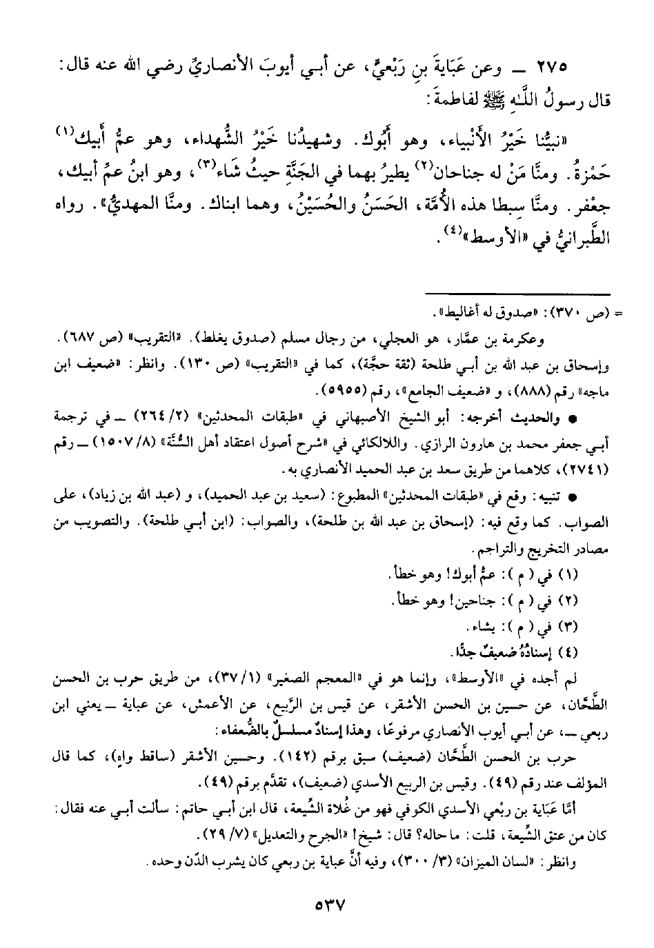 ٢٧٥ - وعن عَبَايةَ بنِ رَبْعيٍّ، عن أبي أيوبَ الأنصاريِّ رضي الله عنه قال: قال رسولُ اللَّهِ -صلى الله عليه وسلم- لفاطمةَ: