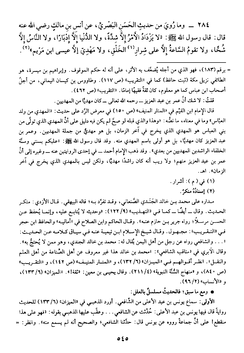 ٢٨٤ - وما رُويَ من حديثِ الحَسَنِ البَصريِّ، عن أنسِ بنِ مالكٍ رضي الله عنه قال: قال رسول الله -صلى الله عليه وسلم-: "لا يَزْدَادُ الأَمْرُ إلَّا شِدَّةً، ولا الدُّنْيا إِلَّا إِدْبَارًا، ولا النَّاسُ إِلَّا شُحًّا، ولا تقومُ السَّاعةُ إِلَّا على شِرارِ (¬١) الخَلْقِ، ولا مَهْدِيّ إلَّا عيسى ابن مَرْيم" (¬٢).