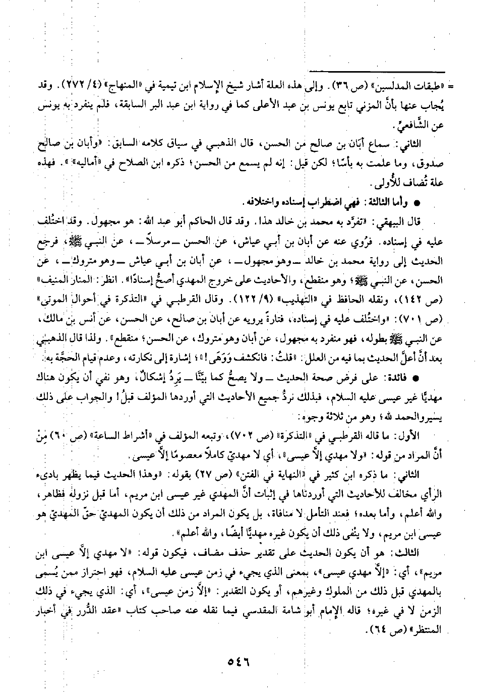 الثالث: هو أن يكون الحديث على تقدير حذف مضاف، فيكون قوله: "لا مهدي إلَّا عيسى ابن مريم"، أي: "إلَّا مهدي عيسى"، بمعنى الذي يجيء في زمن عيسى عيه السلام، فهو احتراز ممن يُسمى بالمهدي قبل ذلك من الملوك وغيرهم، أو يكون التقدير: "إلَّا زمن عيسى"، أي: الذي يجيء في ذلك الزمن لا في غيره؛ قاله الإمام أبو شامة المقدسي فيما نقله عنه صاحب كتاب "عقد الدُّرر في أخبار المنتظر" (ص ٦٤).