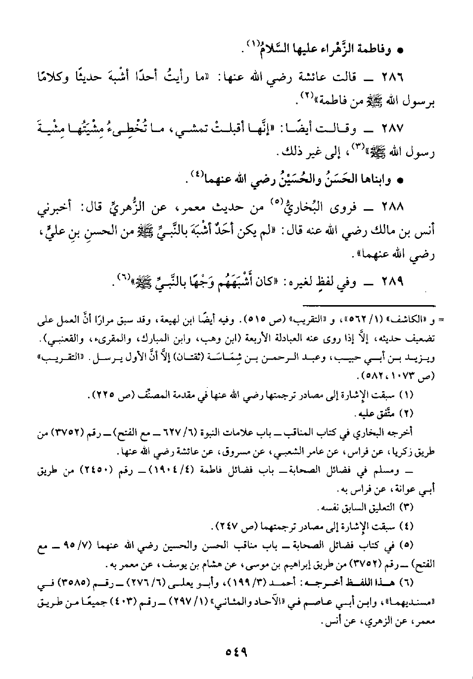 ٢٨٧ - وقالت أيضًا: "إنَّها أقبلتْ تمشي، ما تُخْطِئُ مِشْيَتُها مِشْيةَ رسول الله -صلى الله عليه وسلم-" (¬٣)، إلى غير ذلك.