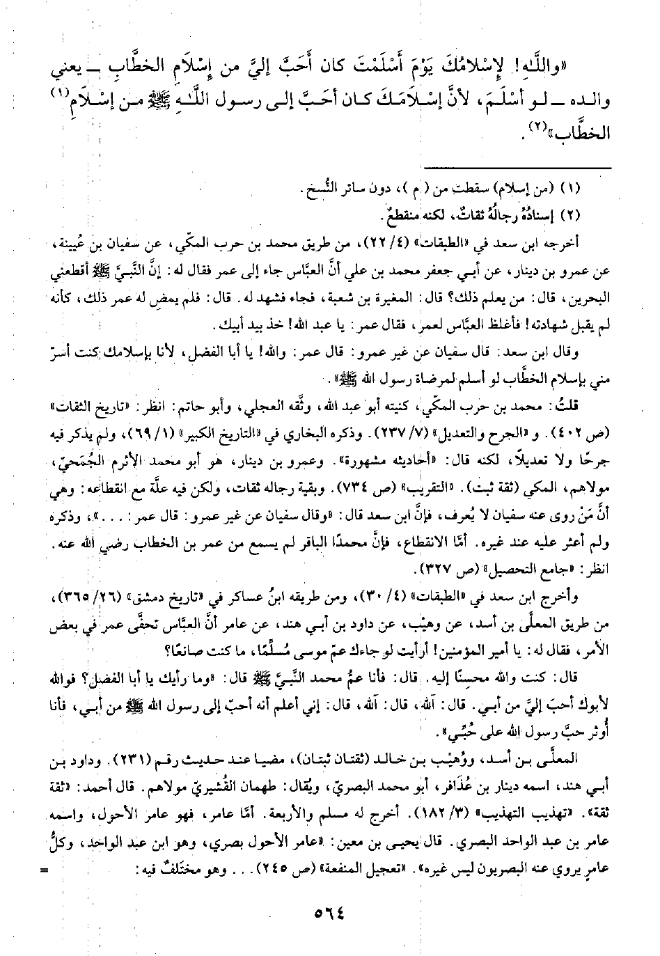 قلتُ: محمد بن حرب المكّي، كنيته أبو عبد الله، وثَّقه العجلي، وأبو حاتم: انظر: "تاريخ الثقات" (ص ٤٠٢). و"الجرح والتعديل" (٧/ ٢٣٧). وذكره البخاري في "التاريخ الكبير" (١/ ٦٩)، ولم يذكر فيه جرحًا ولا تعديلًا، لكنه قال: "أحاديثه مشهورة". وعمرو بن دينار، هو أبو محمد الأثرم الجُمَحيّ، مولاهم، المكي (ثقة ثبت). "التقريب" (ص ٧٣٤). وبقية رجاله ثقات، ولكن فيه علَّة انقطاعه: وهي أن مَنْ روى عنه سفيان لا يُعرف، فإنَّ ابن سعد قال: "وقال سفيان عن غير عمرو: قال عمر: ... "، وذكره ولم أعثر عليه عند غيره. أمَّا الانقطاع، فإنَّ محمدًا الباقر لم يسمع من عمر بن الخطاب رضي الله عنه. انظر: "جامع التحصيل" (ص ٣٢٧).