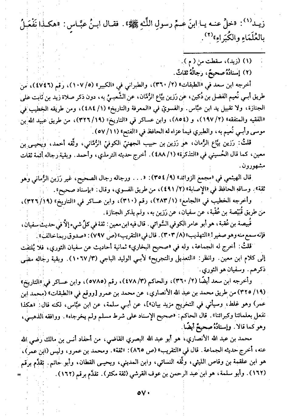 زيد (¬١): "خلِّ عنه يا ابنَ عمِّ رسولِ اللهِ -صلى الله عليه وسلم-". فقال ابنُ عبَّاسٍ: "هكذا نَفْعَلُ بالعُلَمَاءِ والكبَراءِ" (¬٢).