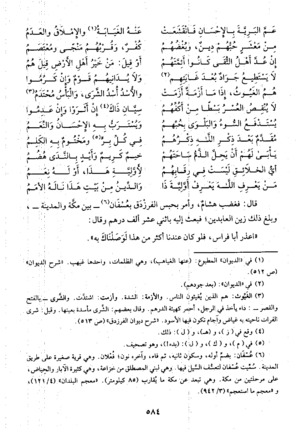 قال: فغضب هشامٌ، وأمر بحبس الفرزْدَق بعُسْفَان (¬٦) -بين مكَّة والمدينة-، وبلغ ذلك زين العابدين؛ فبعث إليه باثني عشر ألف درهم وقال: