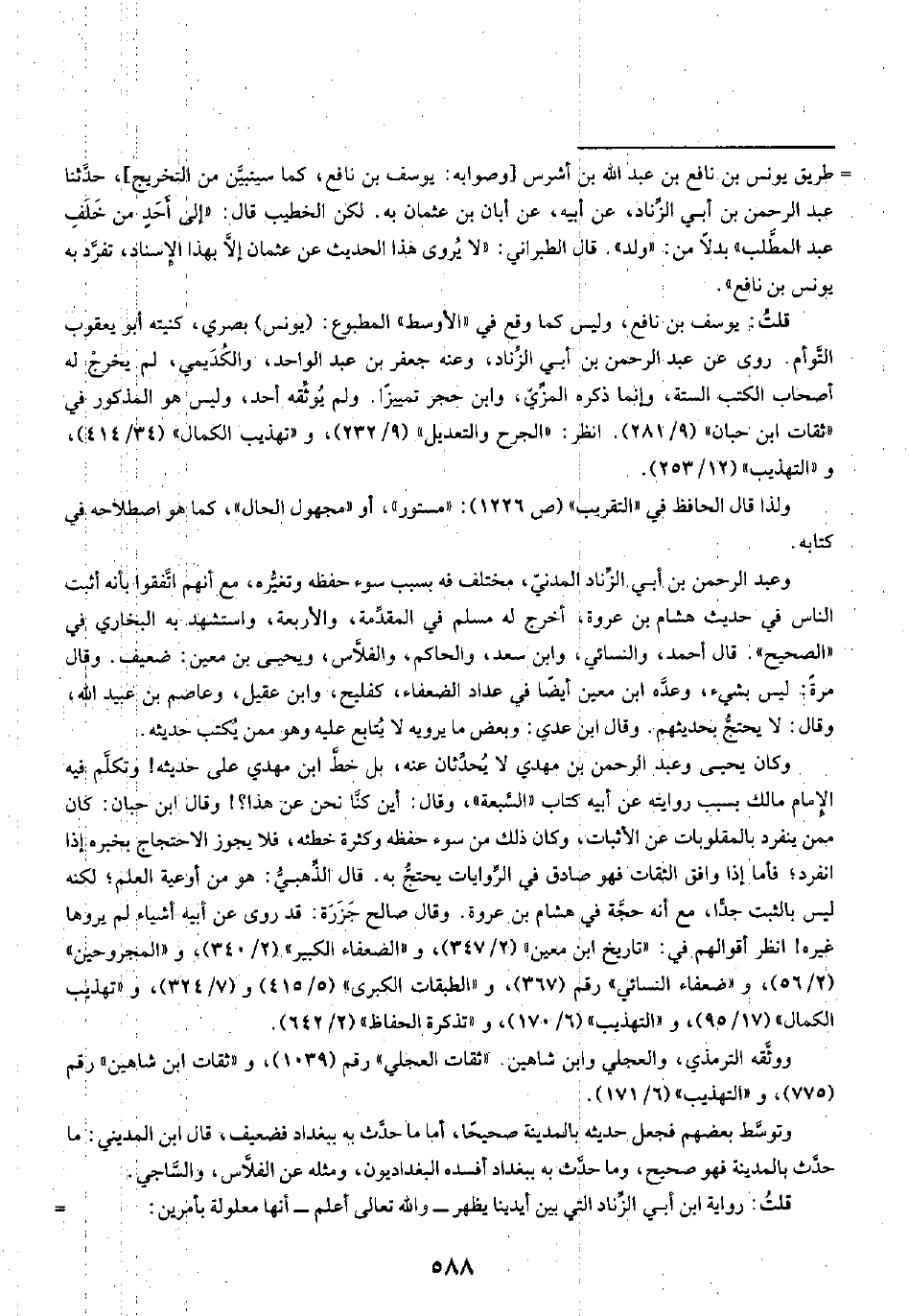 وعبد الرحمن بن أبي الزِّناد المدنيّ، مختلف فيه بسبب سوء حفظه وتغيُّره، مع أنهم اتَّفقوا بأنه أثبت الناس في حديث هشام بن عروة، أخرج له مسلم في المقدِّمة، والأربعة، واستشهد به البخاري في "الصحيح". قال أحمد، والنسائي، وابن سعد، والحاكم، والفلَّاس، ويحيى بن معين: ضعيف. وقال مرةً: ليس بشيء، وعدَّه ابن معين أيضًا في عداد الضعفاء، كفليح، وابن عقيل، وعاصم بن عبيد الله، وقال: لا يحتجُّ بحديثهم. وقال ابن عدي: وبعض ما يرويه لا يُتابع عليه وهو ممن يُكتب حديثه.