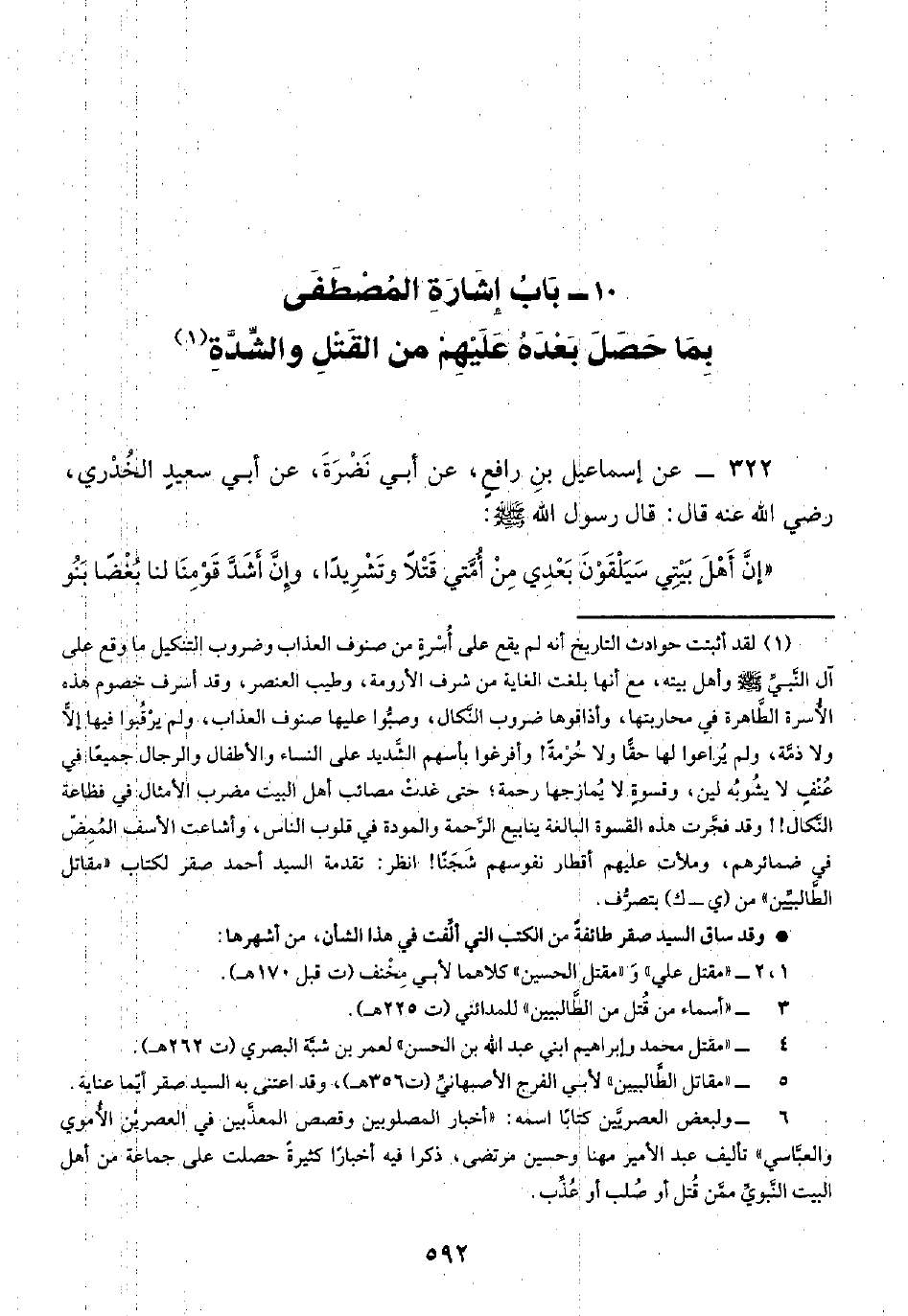 "إنَّ أَهْلَ بَيْتِي سَيَلْقَوْنَ بَعْدِي مِنْ أُمَّتي قَتْلًا وتَشْرِيدًا، وإِنَّ أَشَدَّ قَوْمِنَا لنا بُغْضًا بَنُو