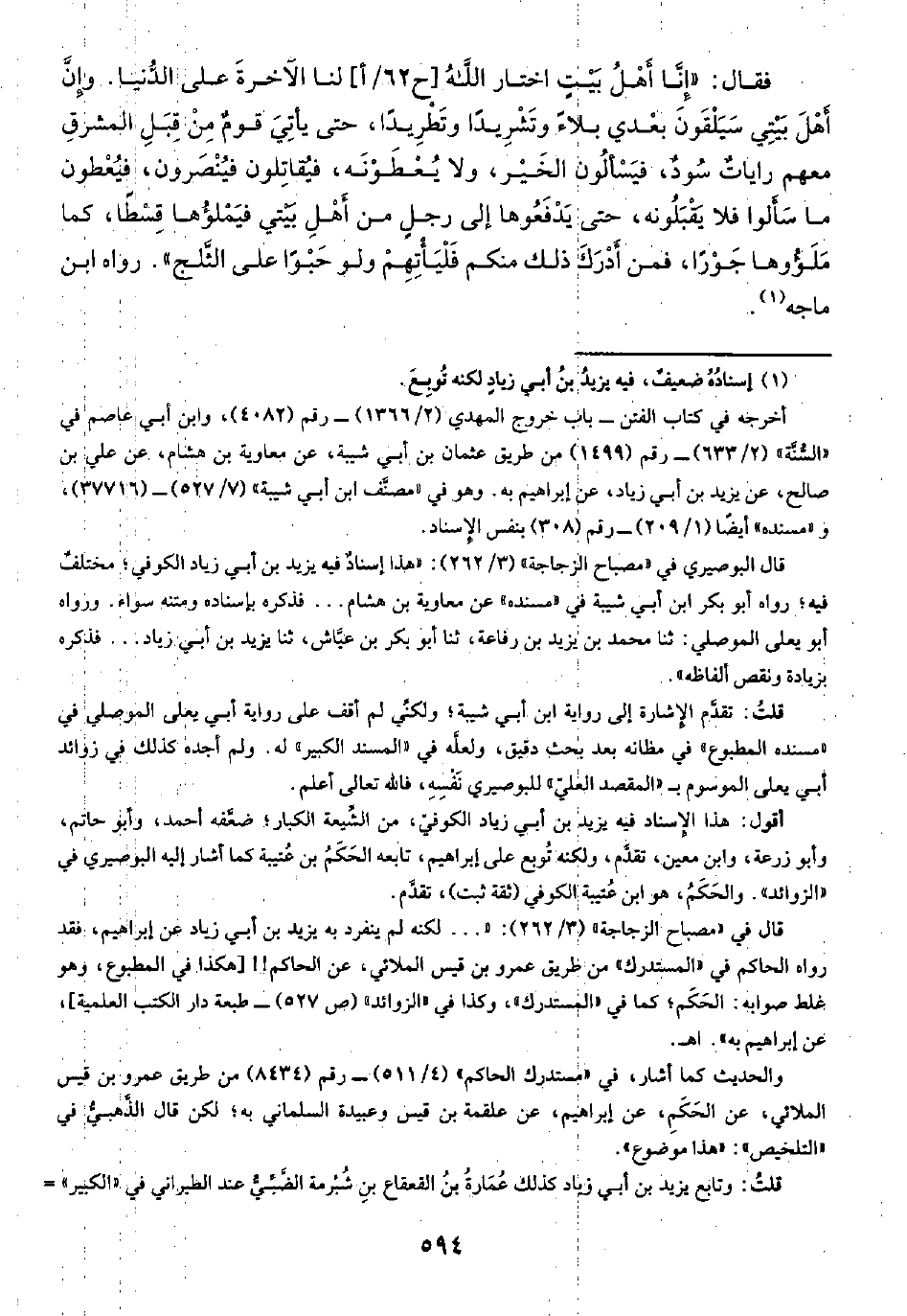 أقول: هذا الإسناد فيه يزيد بن أبي زياد الكوفيّ، من الشِّيعة الكبار؛ ضعَّفه أحمد، وأبو حاتم، وأبو زرعة، وابن معين، تقدِّم، ولكنه تُوبع على إبراهيم، تابعه الحَكَمُ بن عُتيبة كما أشار إليه البوصيري في "الزوائد". والحَكَمُ، هو ابن عُتيبة الكوفي (ثقة ثبت)، تقدَّم.