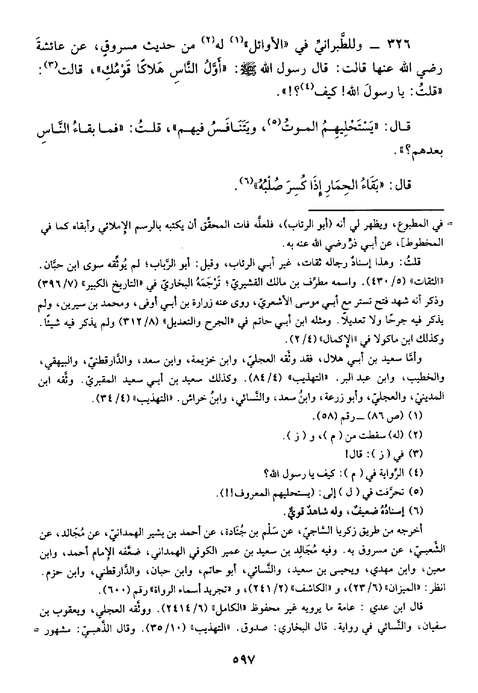 ٣٢٦ - وللطَّبرانيِّ في "الأوائل" (¬١) له (¬٢) من حديث مسروقٍ، عن عائشةَ رضي الله عنها قالت: قال رسول الله -صلى الله عليه وسلم-: "أَوَّلُ النَّاس هَلاكًا قَوْمُكِ"، قالت (¬٣): "قلتُ: يا رسولَ الله! كيف (¬٤)؟ ! ".
