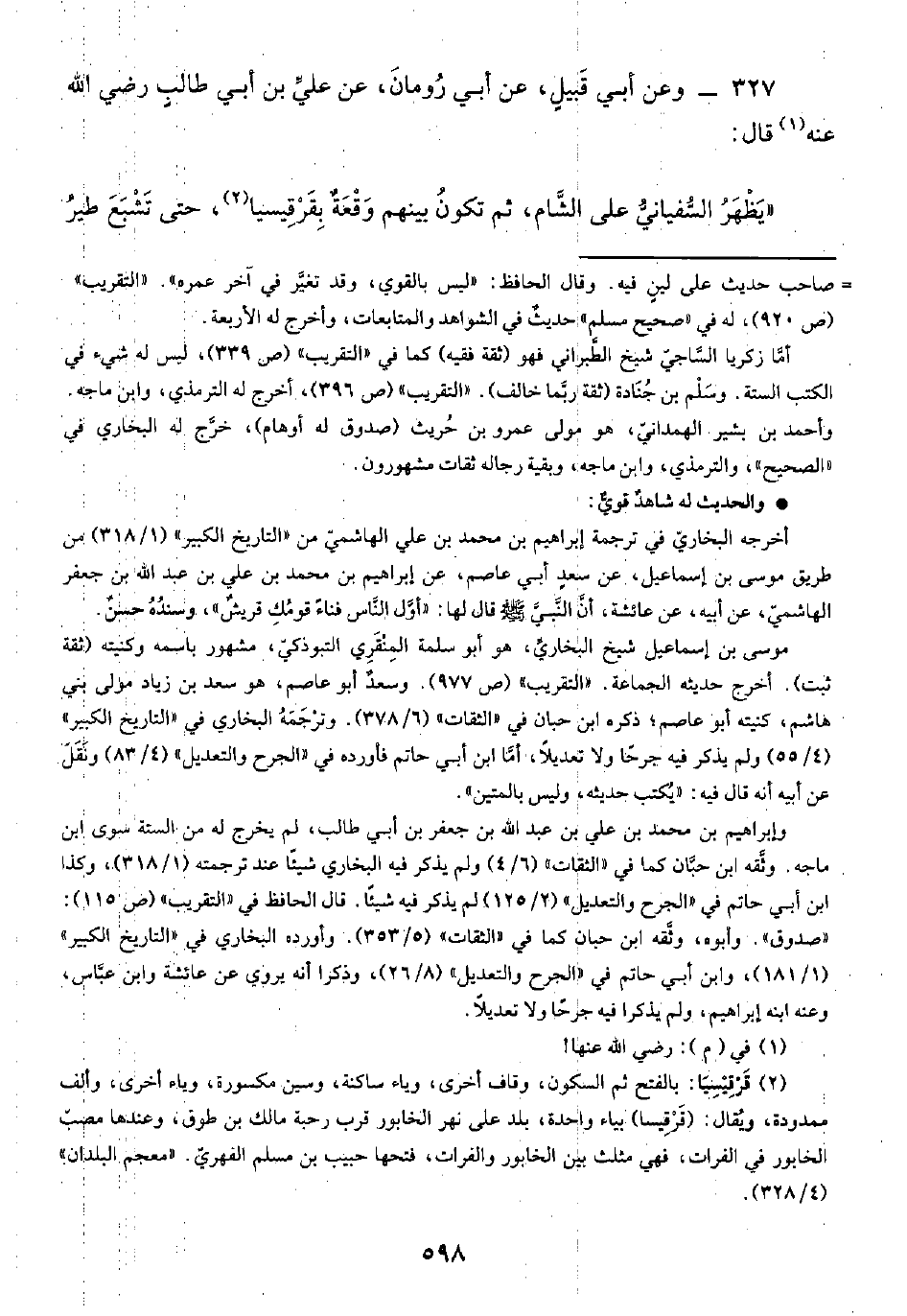 "يَظْهَرُ السُّفيانيُّ على الشَّام، ثم تكونُ بينهم وَقْعَةٌ بِقَرْقِيسيا (¬٢)، حتى تَشْبَعَ طيرُ