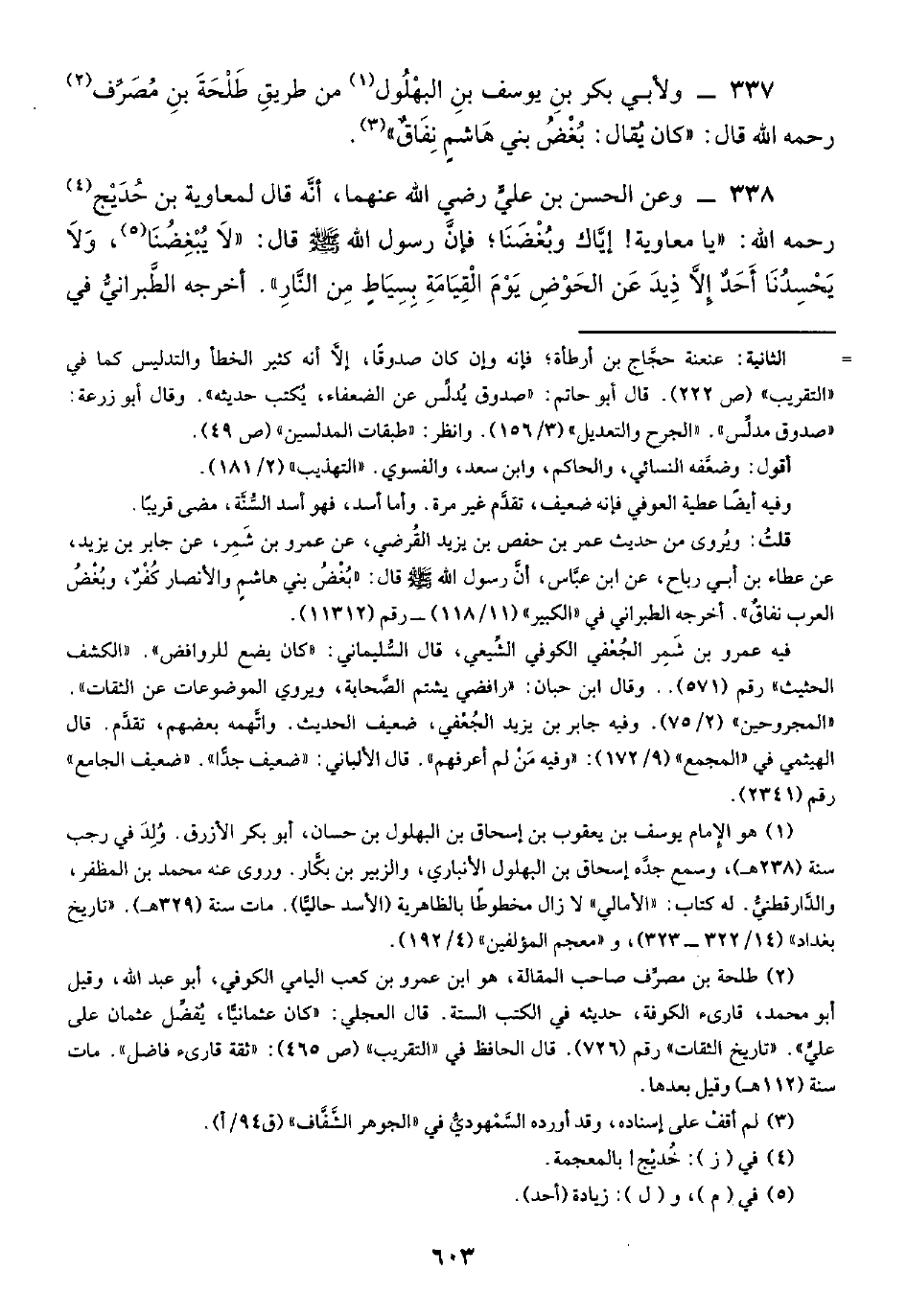 ٣٣٧ - ولأبي بكر بنِ يوسف بنِ البهْلُول (¬١) من طريقِ طَلْحَةَ بنِ مُصَرِّف (¬٢) رحمه الله قال: "كان يُقال: بُغْضُ بني هَاشمٍ نِفَاقٌ" (¬٣).