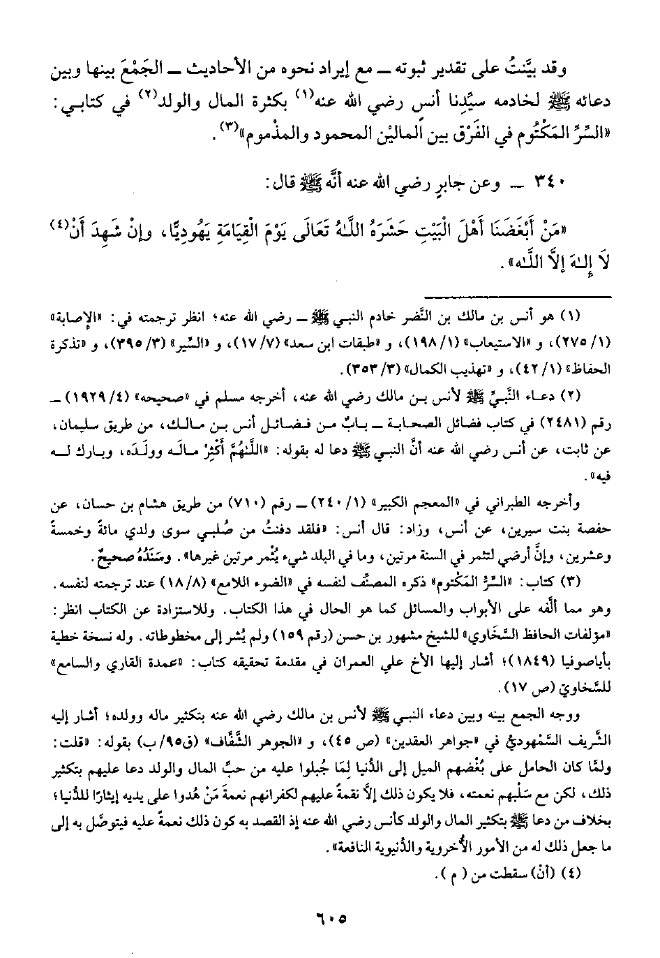 وقد بيَّنتُ على تقدير ثبوته -مع إيراد نحوه من الأحاديث- الجَمْعَ بينها وبين دعائه -صلى الله عليه وسلم- لخادمه سيِّدِنا أنسٍ رضي الله عنه (¬١) بكثرة الحال والولد (¬٢) في كتابي: "السِّرِّ المَكْتُوم في الفَرْق بين الماليْن المحمود والمذْموم" (¬٣).