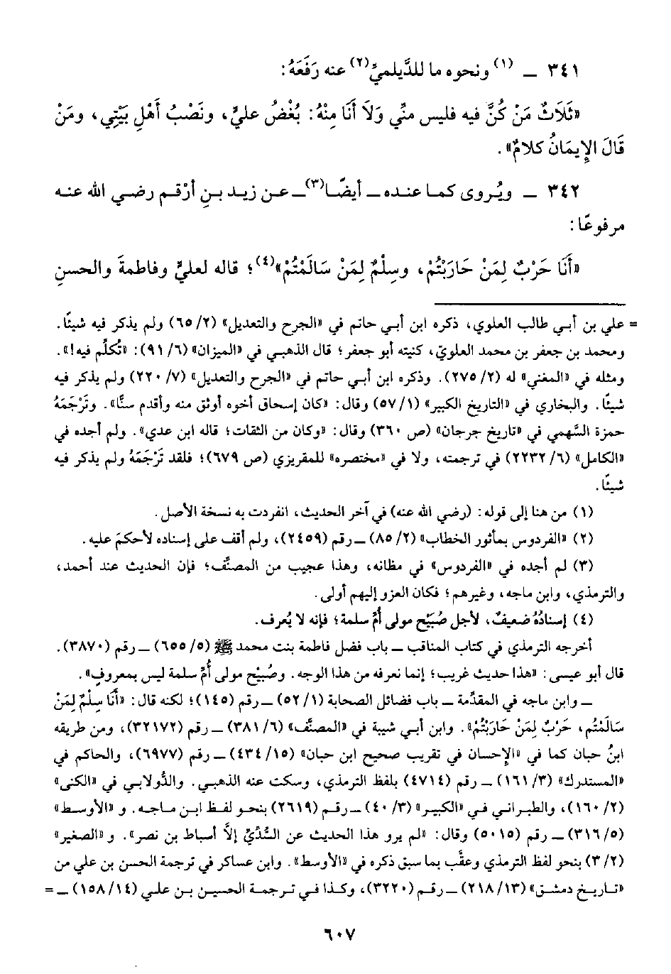 "أَنَا حَرْبٌ لِمَنْ حَارَبْتُمْ، وسِلْمٌ لِمَنْ سَالَمْتُمْ" (¬٤)؛ قاله لعليٍّ وفاطمةَ والحسنِ