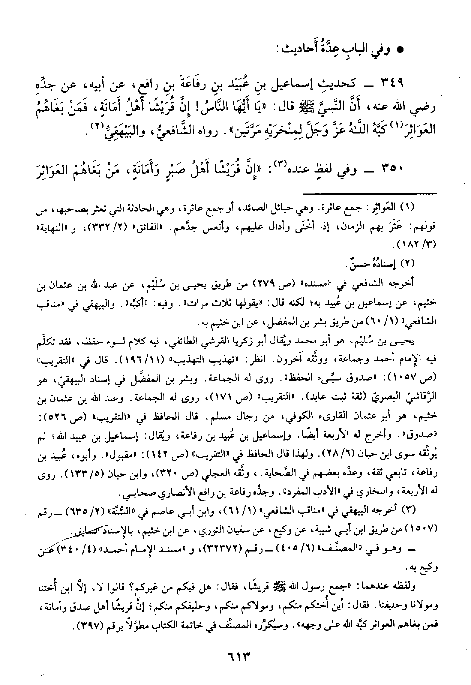 ٣٤٩ - كَحديثِ إسماعيل بنِ عُبَيْد بنِ رفَاعَةَ بنِ رافعٍ، عن أبيه، عن جدِّهِ رضي الله عنه، أَنَّ النَّبيَّ -صلى الله عليه وسلم- قال: "يَا أَيُّهَا النَّاسُ! إِنَّ قرَيْشًا أَهْلُ أَمَانَةٍ، فَمَنْ بَغَاهُمُ العَوَاثِرَ (¬١) كَبَّهُ اللَّهُ عَزَّ وَجَلَّ لِمِنْخرَيْهِ مَرَّتَين". رواه الشَّافعيُّ، والبَيْهَقِيُّ (¬٢).