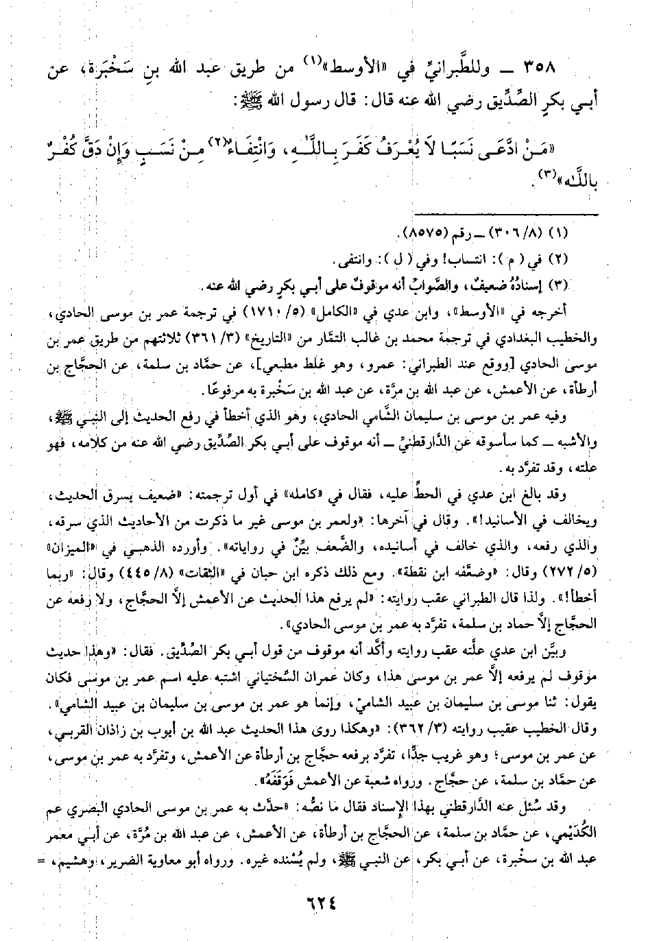 وقد سُئل عنه الدَّارقطني بهذا الإسناد فقال ما نصُّه: "حدَّث به عمر بن موسى الحادي البصري عم الكُدَيْمي، عن حمَّاد بن سلمة، عن الحجَّاج بن أرطأة، عن الأعمش، عن عبد الله بن مُرَّة، عن أبي معمر عبد الله بن سخْبرة، عن أبي بكر، عن النبي -صلى الله عليه وسلم-، ولم يُسْنده غيره. ورواه أبو معاوية الضرير، وهشيم، =