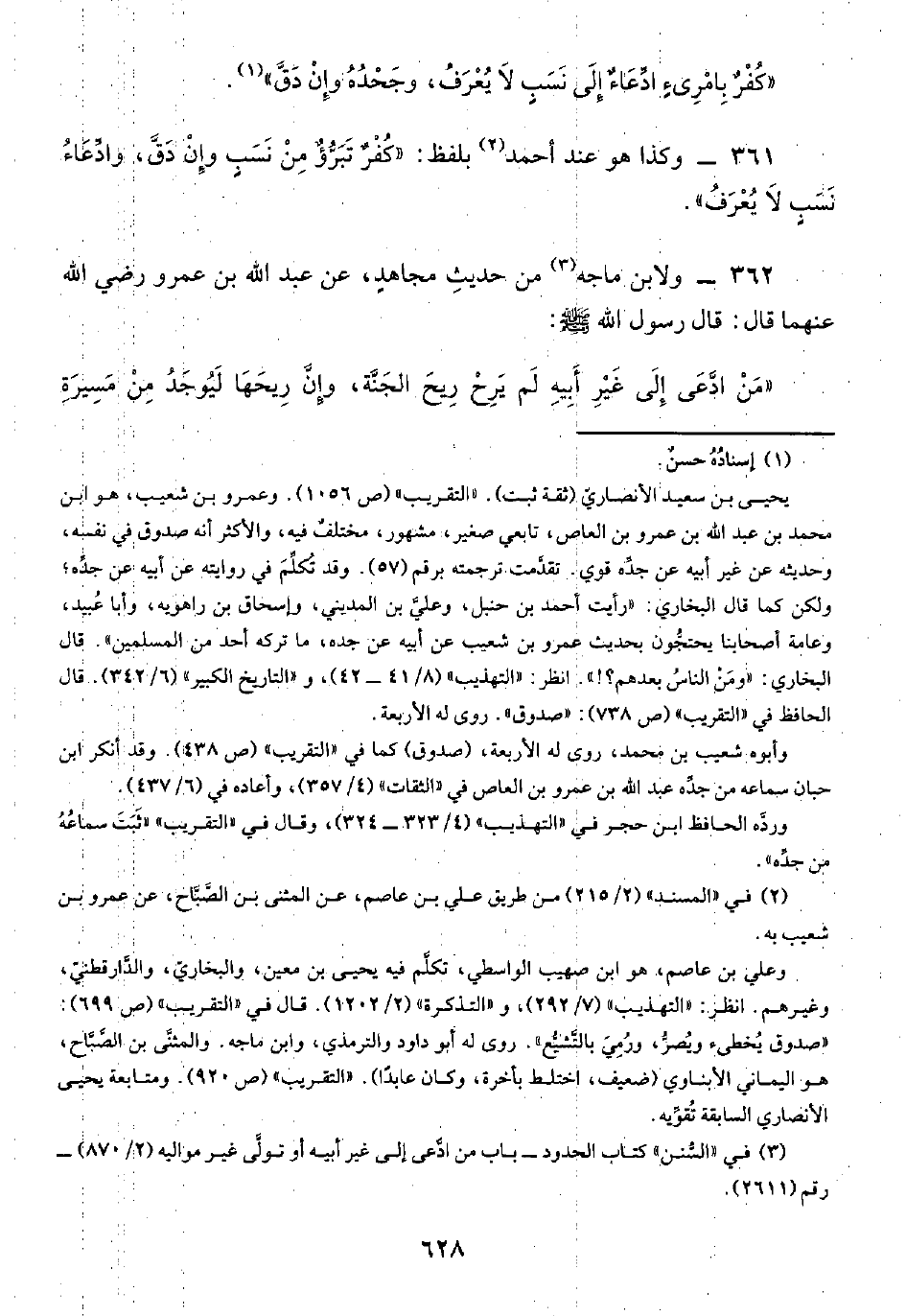 ٣٦١ - وكذا هو عند أحمد (¬٢) بلفظ: "كُفْرٌ تَبَرُّؤٌ مِنْ نَسَبٍ وإِنْ دَقَّ، وادِّعَاءُ نَسَب لَا يُعْرَفُ".