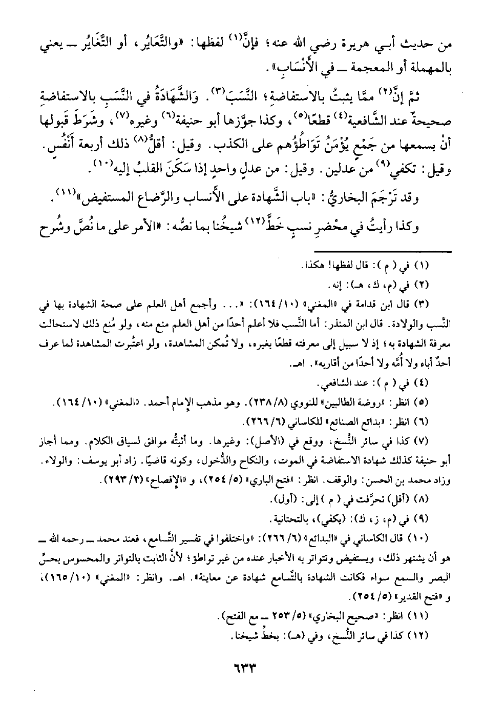 (¬٣) قال ابن قدامة في "المغني" (١٠/ ١٦٤): " ... وأجمع أهل العلم على صحة الشهادة بها في النَّسب والولادة. قال ابن المنذر: أما النَّسب فلا أعلم أحدًا من أهل العلم منع منه، ولو مُنع ذلك لاستحالت معرفة الشهادة به؛ إذ لا سبيل إلى معرفته قطعًا بغيره، ولا تُمكن المشاهدة، ولو اعتُبرت المشاهدة لما عرف أحدٌ أباه ولا أُمَّه ولا أحدًا من أقاربه". اهـ.