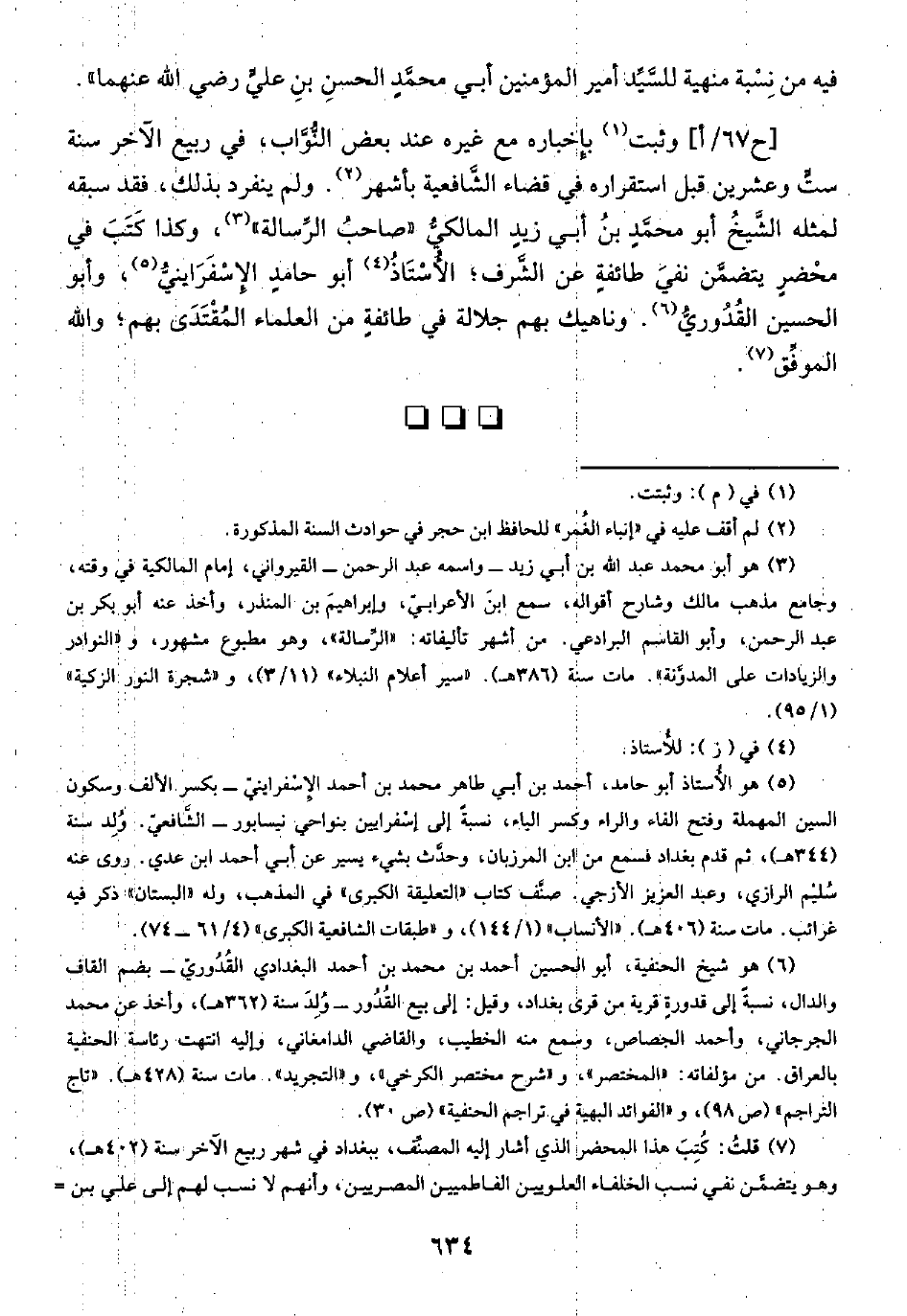 وثبت (¬١) بإخباره مع غيره عند بعض النُّوَّاب، في ربيع الآخر سنة ستٍّ وعشرين قبل استقراره في قضاء الشَّافعية بأشهر (¬٢). ولم ينفرد بذلك، فقد سبقه لمثله الشَّيخُ أبو محمَّدٍ بنُ أبي زيدٍ المالكيُّ "صاحبُ الرِّسالة" (¬٣)، وكذا كَتَبَ في محْضرٍ يتضمَّن نفيَ طائفةٍ عن الشَّرف؛ الأُسْتَاذُ (¬٤) أبو حامدٍ الإِسْفَرَاينيُّ (¬٥)، وأبو الحسين القُدُوريُّ (¬٦). وناهيك بهم جلالة في طائفةٍ من العلماء المُقْتَدَى بهم؛ والله الموفِّق (¬٧).