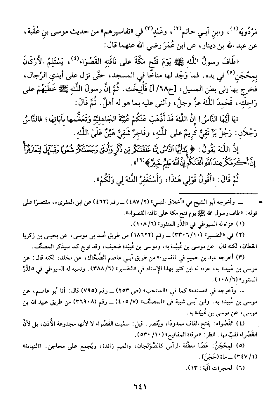 "طَافَ رسولُ اللَّهِ -صلى الله عليه وسلم- يَوْمَ فَتْح مَكُّةَ على نَاقَتِهِ القَصْوَاء (¬٤)، يَسْتَلِمُ الأَرْكَانَ بِمِحْجَنٍ (¬٥) في يده. فما وَجَد لها مناخًا في المسجد، حتَّى نزل على أيدي الرجال، فخرج بها إلى بطن المسيل، فَأُنِيخَت. ثُمَّ إنَّ رسولَ اللَّهِ -صلى الله عليه وسلم- خَطَبَهُمْ على رَاحِلَتِه، فَحَمِدَ اللَّهَ عزَّ وجلَّ، وأثنى عليه بما هو له أهلٌ. ثُمَّ قَالَ: