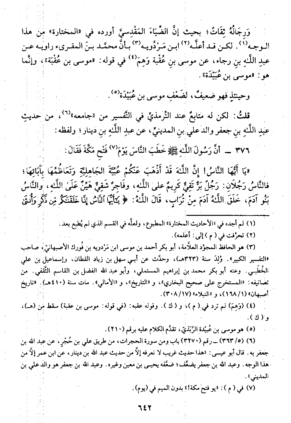 (¬٦) (٥/ ٣٦٣) - رقم (٣٢٧٠) باب ومن سورة الحجرات، من طريق علي بن حُجْرٍ، عن عبد الله بن جعفر به. قال أبو عيسى: "هذا حديث غريب لا نعرفه إلَّا من حديث عبد الله بن دينار، عن ابن عمر إِلَّا من هذا الوجه. وعبد الله بن جعفر يضعَّف؛ ضعَّفه يحيى بن معين وغيره. وعبد الله بن جعفر هو والد علي بن المديني".