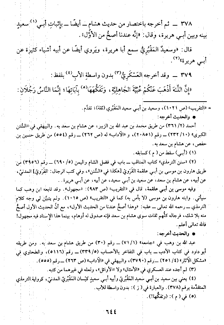 (¬٤) يعني بين سعيد بن أبي سعيد المَقْبُريْ وأبيه أبي سعيدٍ كيْسان المَقْبُريّ المدنيّ، كرواية الترمذي المتقدِّمة برقم (٣٧٨). والعبارة في (ز): بدون واسطة للأب.