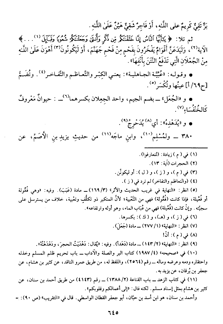 ثم تلا: {يَاأَيُّهَا النَّاسُ إِنَّا خَلَقْنَاكُمْ مِنْ ذَكَرٍ وَأُنْثَى وَجَعَلْنَاكُمْ شُعُوبًا وَقَبَائِلَ (¬١) ... } الآية (¬٢)، وَلَيَدَعَنَّ أَقْوَامٌ يَفْخَرُونَ بِفَحْمٍ مِنْ فَحْمِ جَهَنَّمَ، أَوْ لَيَكونُونَ (¬٣) أَهْوَنَ عَلَى اللَّهِ مِنْ الجُعْلَانِ الَّتِي تَدْفَعُ النَّتَنَ بِأَنْفِهَا".