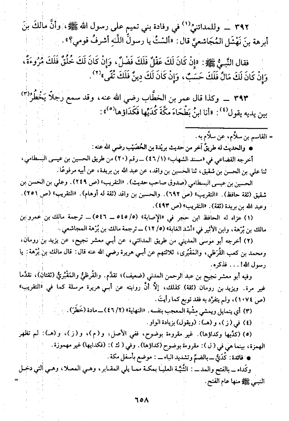 ٣٩٢ - وللمدائنيِّ (¬١) في وفادة بني تميمٍ على رسول الله -صلى الله عليه وسلم-، وأنَّ مالكَ بنَ أبرهة بنَ نَهْشَل المُجَاشعيَّ قال: "ألسْتُ يا رسولَ اللَّهِ أشرفُ قومي؟ ".