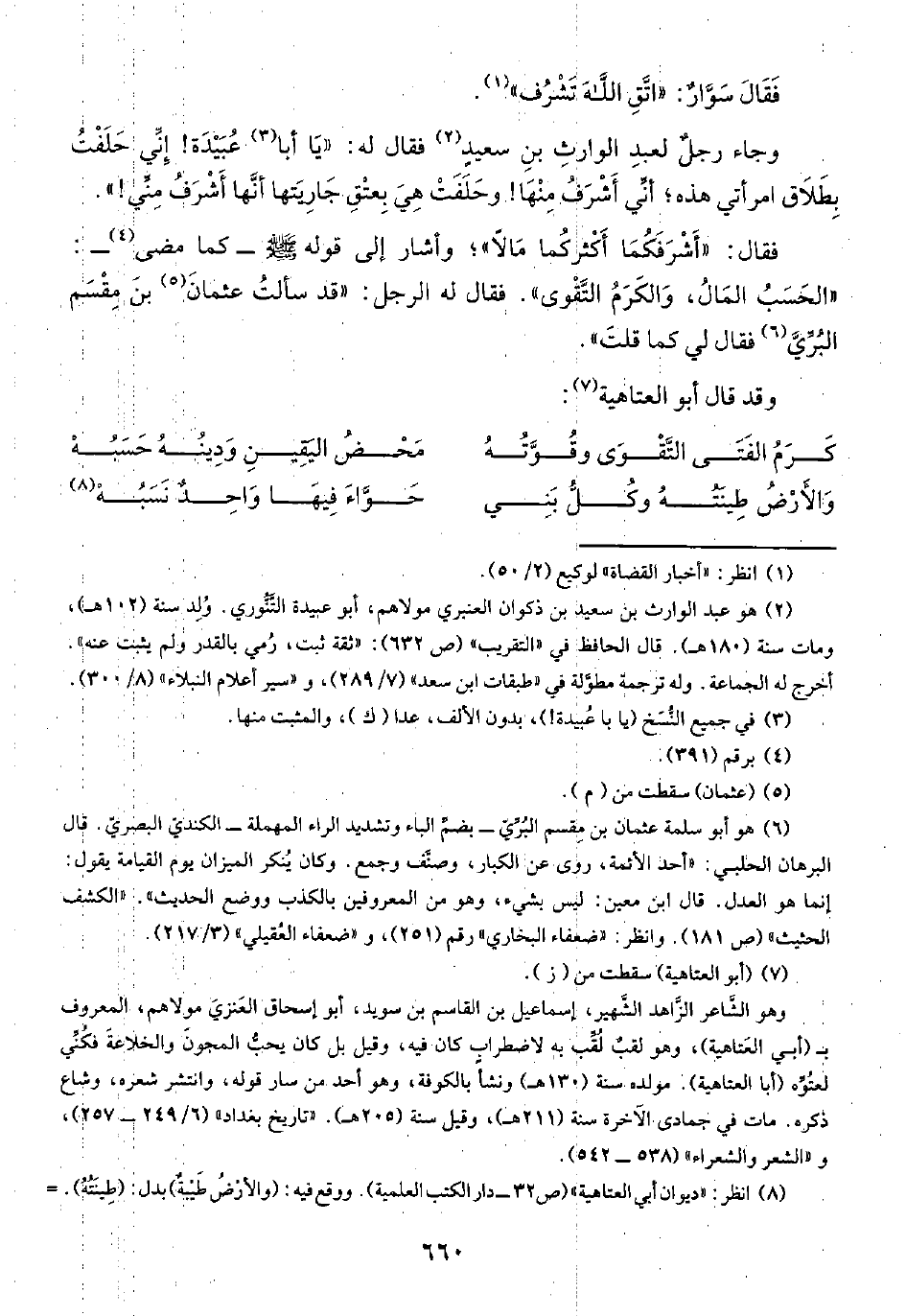 وجاء رجلٌ لعبدِ الوارثِ بنِ سعيدٍ (¬٢) فقال له: "يَا أبا (¬٣) عُبَيْدَة! إِنّي حَلَفْتُ بِطَلَاق امرأتي هذه؛ أنِّي أَشْرَفُ مِنْهَا! وحَلَفَتْ هِيَ بِعتْقِ جَارِيَتها أنَّها أَشْرَفُ مِنِّي! ".