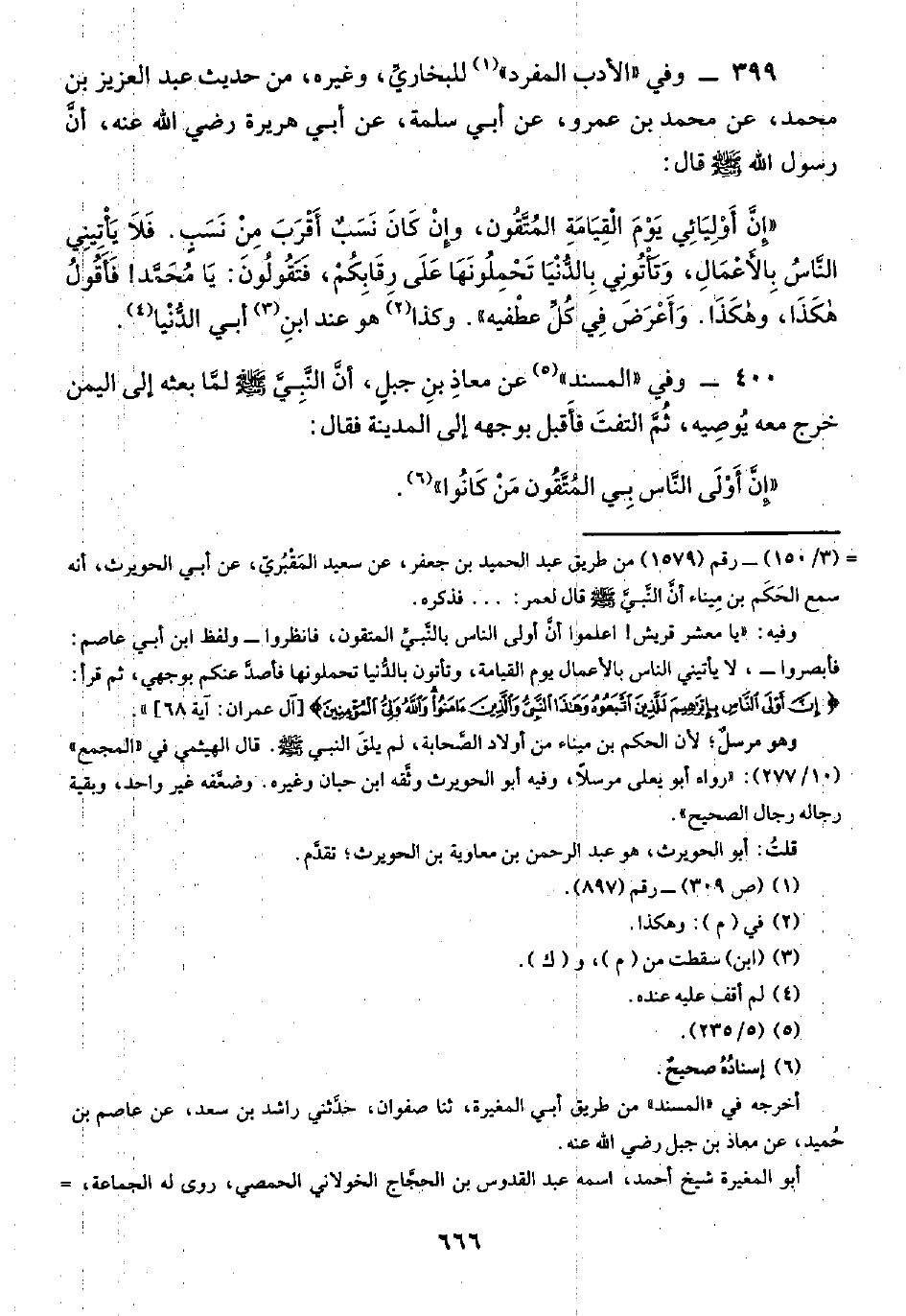 وفيه: "يا معشر قريش! اعلموا أن أولى الناس بالنَّبيِّ المتقون، فانظروا -ولفظ ابن أبي عاصم: فأبصروا-، لا يأتيني الناس بالأعمال يوم القيامة، وتأتون بالدُّنيا تحملونها فأصدَّ عنكم بوجهي، ثم قرأ: {إِنَّ أَوْلَى النَّاسِ بِإِبْرَاهِيمَ لَلَّذِينَ اتَّبَعُوهُ وَهَذَا النَّبِيُّ وَالَّذِينَ آمَنُوا وَاللَّهُ وَلِيُّ الْمُؤْمِنِينَ} [آل عمران: آية ٦٨] ".