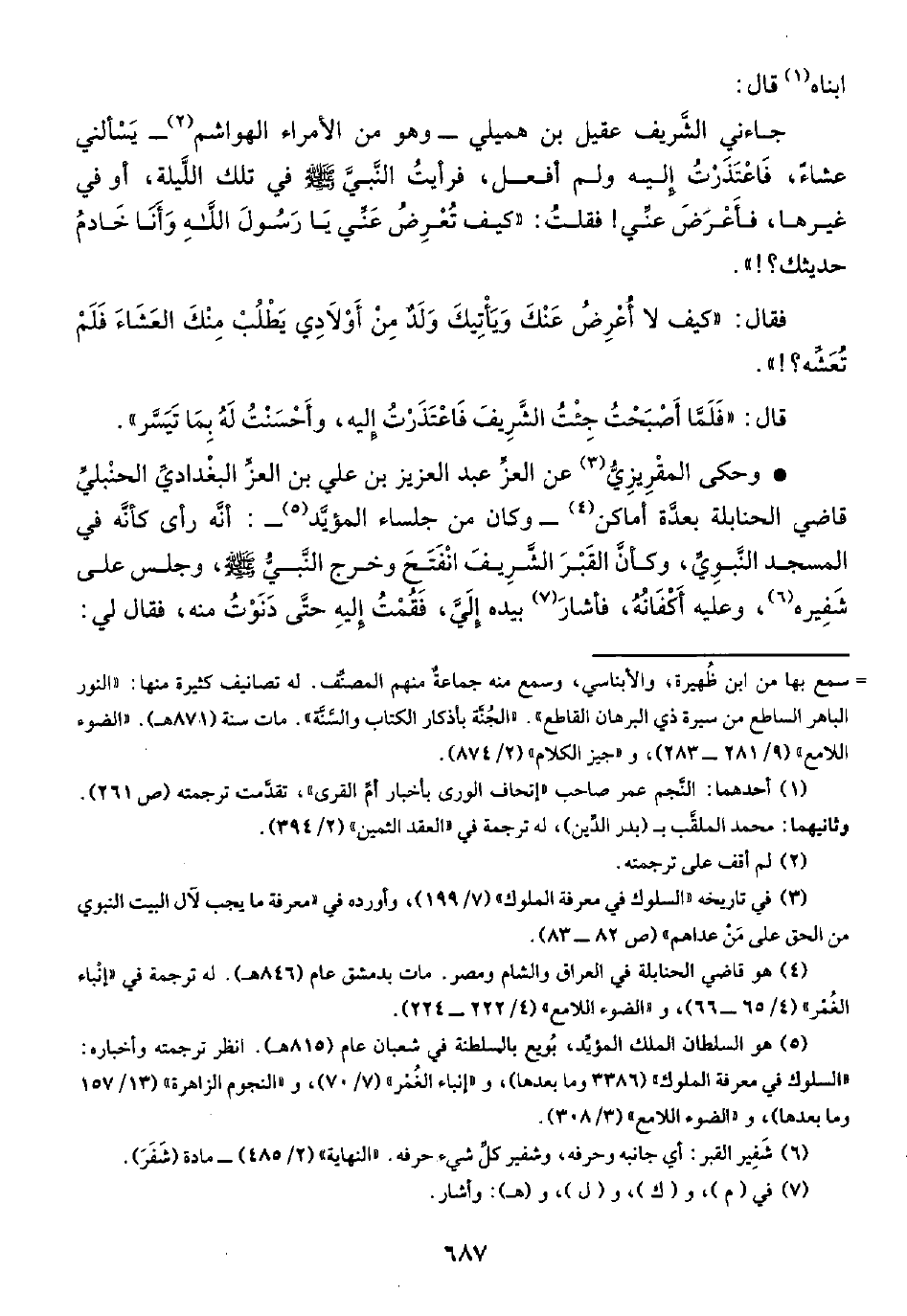 • وحكى المقْرِيزِيُّ (¬٣) عن العزِّ عبد العزيز بن علي بن العزِّ البغْداديِّ الحنْبليِّ قاضي الحنابلة بعدَّة أماكن (¬٤) -وكان من جلساء المؤيَّد (¬٥) -: أنَّه رأى كأنَّه في المسجد النَّبوِيِّ، وكأنَّ القَبْرَ الشَّرِيفَ انْفَتَحِ وخرج النَّبيُّ -صلى الله عليه وسلم-، وجلس على شَفِيره (¬٦)، وعليه أَكْفَانُهُ، فأشارَ (¬٧) بيده إِلَيَّ، فَقُمْتُ إِليهِ حتَّى دَنَوْتُ منه، فقال لي: