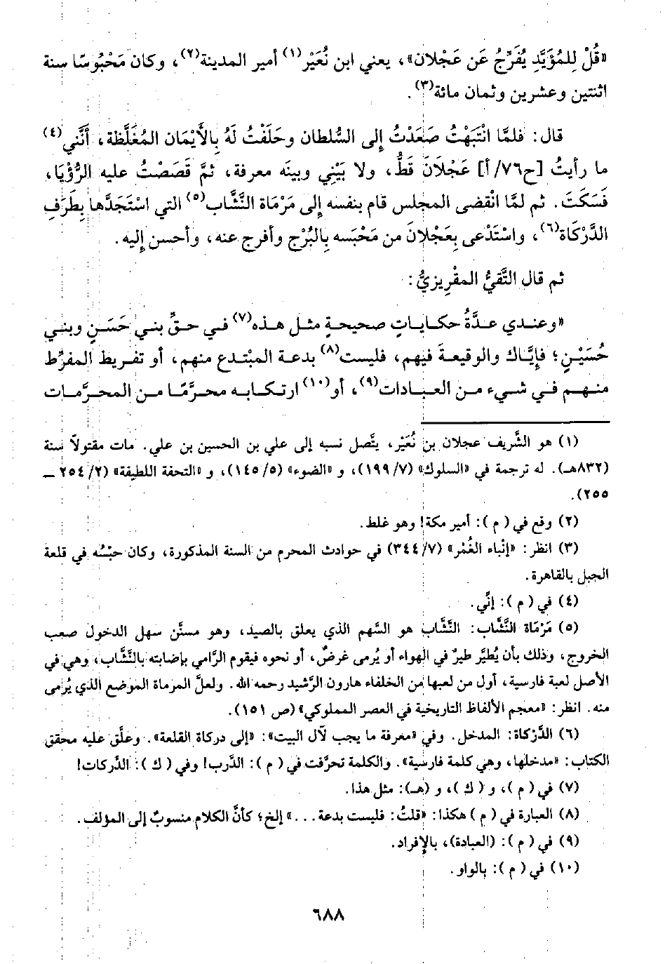 (¬١) هو الشَّريف عجلان بن نُعَيْر، يتَّصل نسبه إلى علي بن الحسن بن علي. مات مقتولًا سنة (٨٣٢ هـ). له ترجمة في "السلوك" (٧/ ١٩٩)، و"الضوء" (٥/ ١٤٥)، و"التحفة اللطيفة" (٢/ ٢٥٤ - ٢٥٥).