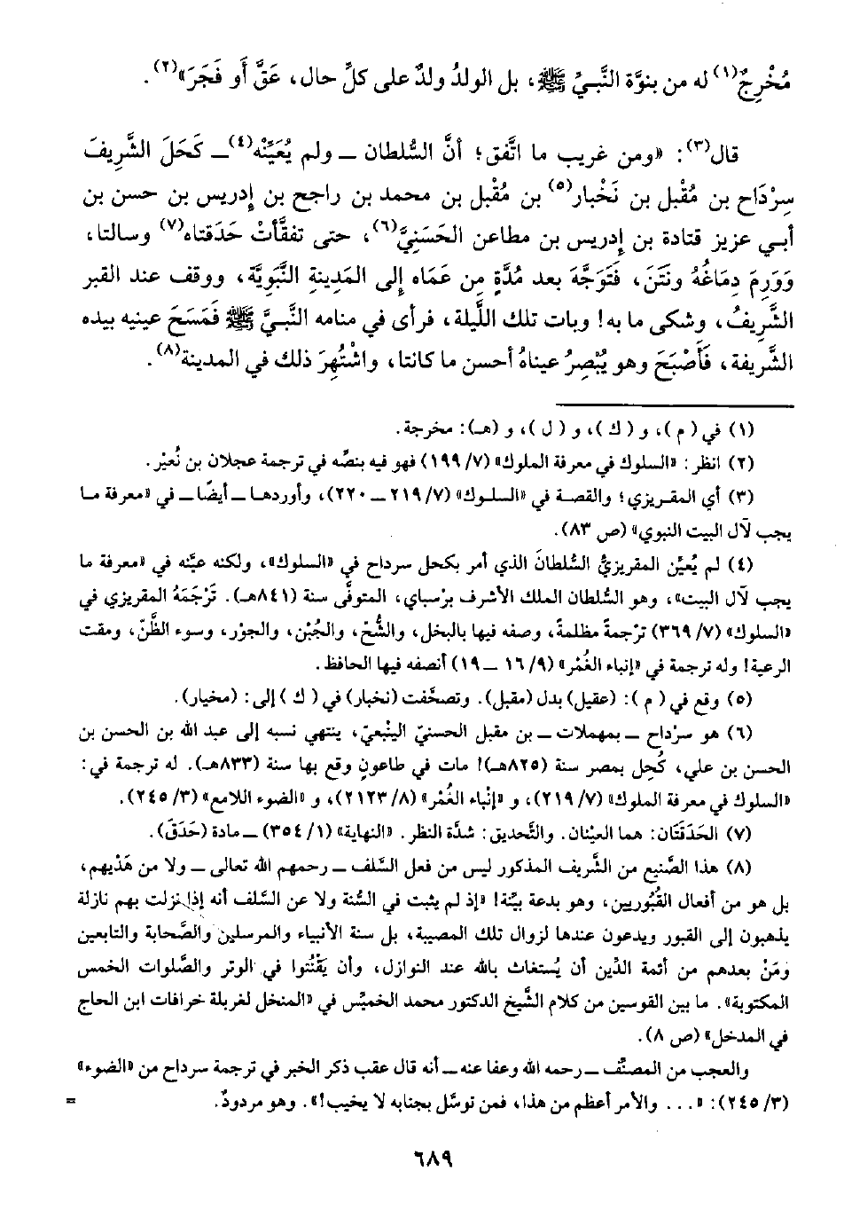 (¬٨) هذا الصَّنيع من الشَّريف المذكور ليس من فعل السَّلف -رحمهم الله تعالى- ولا من هَدْيهم، بل هو من أفعال القُبُوريين، وهو بدعة بيِّنة! "إذ لم يثبت في السُّنة ولا عن السَّلف أنه إذا نزلت بهم نازلة يذهبون إلى القبور ويدعون عندها لزوال تلك المصيبة، بل سنة الأنبياء والمرسلين والصَّحابة والتابعين ومَنْ بعدهم من أئمة الدِّين أن يُستغاث بالله عند النوازل، وأن يَقْنُتوا في الوتر والصَّلوات الخمس المكتوبة". ما بين القوسين من كلام الشيخ الدكتور محمد الخميِّس في "المنخل لغربلة خرافات ابن الحاج في المدخل" (ص ٨).
