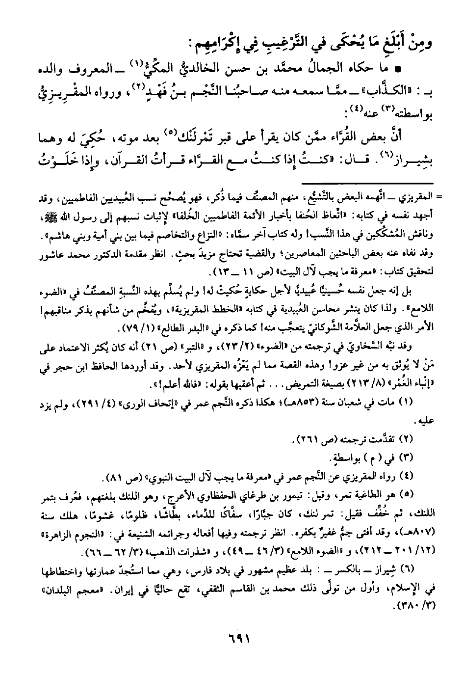 = المقريزي -اتَّهمه البعض بالتَّشيُّع, منهم المصنِّف فيما ذُكر، فهو يُصحِّح نسب العُبيديين الفاطميين، وقد أجهد نفسه في كتابه: "اتَّعاظ الحُنفا بأخبار الأئمة الفاطميين الخُلفا" لإِثبات نسبهم إلى رسول الله -صلى الله عليه وسلم-، وناقش المُشكِّكين في هذا النَّسب! وله كتاب آخر سمَّاه: "النزاع والتخاصم فيما بين بني أمية وبني هاشم". وقد نفاه عنه بعض الباحثين المعاصرين؛ والقضية تحتاج مزيدَ بحثٍ. انظر مقدمة الدكتور محمد عاشور لتحقيق كتاب: "معرفة ما يجب لآل البيت" (ص ١١ - ١٣).