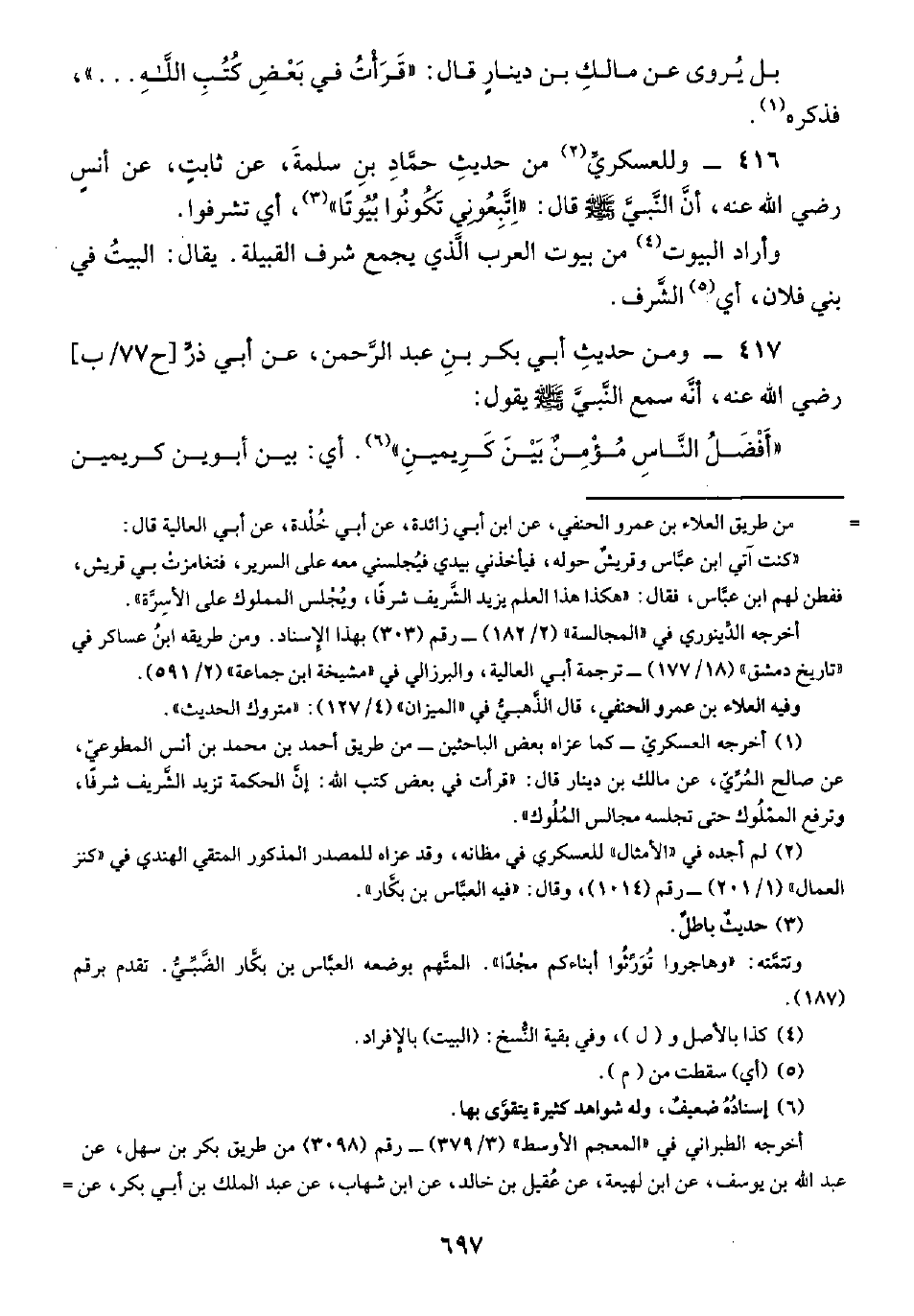 ٤١٦ - وللعسكريِّ (¬٢) من حديثِ حمَّادِ بنِ سلمةَ، عن ثابتٍ، عن أنس -رضي الله عنه-، أن النَّبيَّ -صلى الله عليه وسلم- قال: "اِتَّبِعُونِي تَكُونُوا بُيُوتًا" (¬٣)، أي تشرفوا.