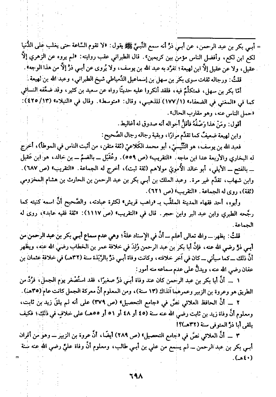 ٣ - أن العلائي نصَّ في "جامع التحصيل" (ص ٢٨٩) أيضًا، أن عروة بن الزبير -وهو من أقران أبي بكر بن عبد الرحمن- لم يسمع من علي بن أبي طالب، ومعلوم أن وفاة علي -رضي الله عنه- سنة (٤٠ هـ). =