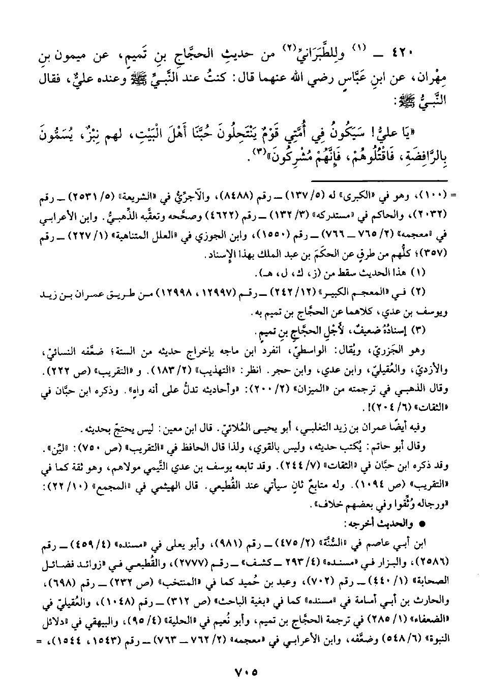 ٤٢٠ - (¬١) ولِلطَّبَرَانيِّ (¬٢) من حديثِ الحجَّاجِ بنِ تَميمٍ، عن ميمون بنِ مِهْران، عن ابن عَبَّاس رضي الله عنهما قال: كنتُ عند النَّبيِّ -صلى الله عليه وسلم- وعنده عليٌّ, فقال النَّبيُّ -صلى الله عليه وسلم-: