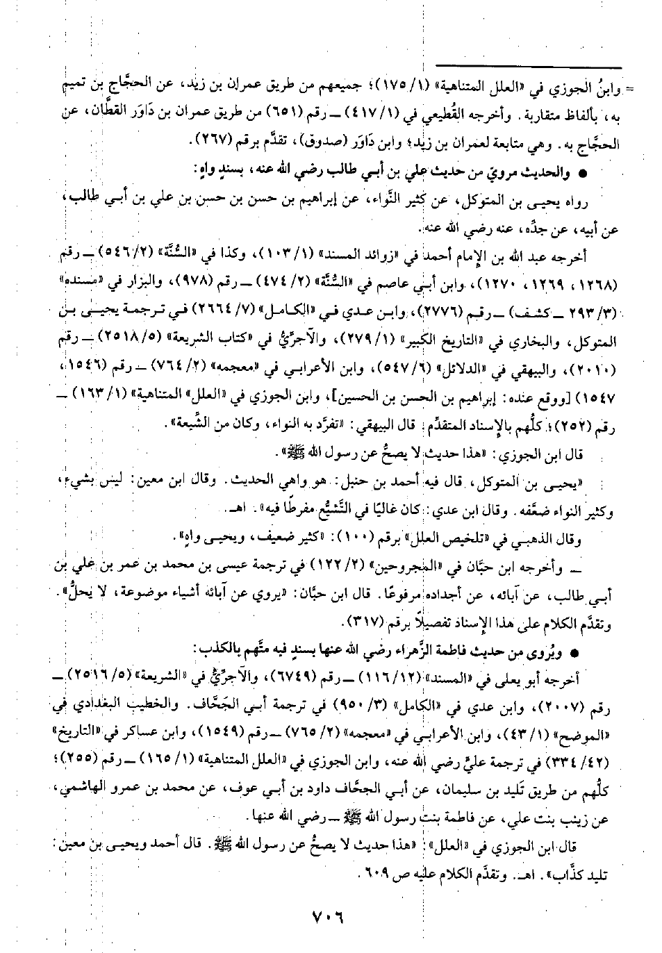 أخرجه أبو يعلى في "المسند" (١٢/ ١١٦) - رقم (٦٧٤٩)، والآجرِّيُّ في "الشريعة" (٥/ ٢٥١٦) - رقم (٢٠٠٧)، وابن عدي في "الكامل" (٣/ ٩٥٠) في ترجمة أبي الجَحَّاف. والخطيب البغدادي في "الموضح" (١/ ٤٣)، وابن الأعرابي في "معجمه" (٢/ ٧٦٥) - رقم (١٥٤٩)، وابن عساكر في "التاريخ" (٤٢/ ٣٣٤) في ترجمة عليٍّ رضي الله عنه، وابن الجوزي في "العلل المتناهية" (١/ ١٦٥) - رقم (٢٥٥)؛ كلُّهم من طريق تَليد بن سليمان، عن أبي الججَّاف داود بن أبي عوف، عن محمد بن عمرو الهاشمي، عن زينب بنت علي، عن فاطمة بنت رسول الله -صلى الله عليه وسلم- رضي الله عنها.