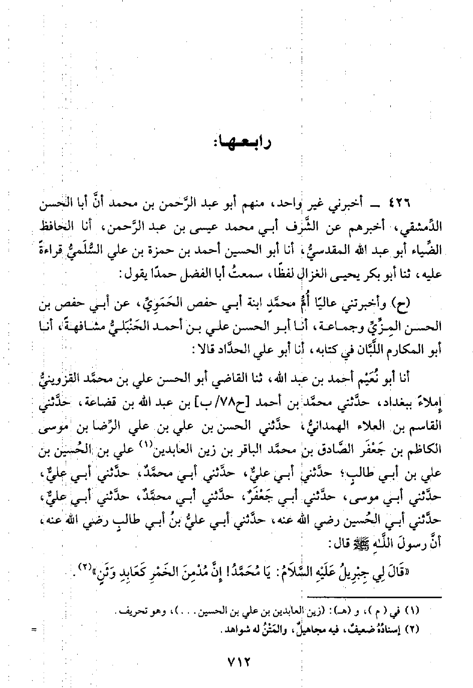 ٤٢٦ - أخبرني غير واحد، منهم أبو عبد الرَّحمن بن محمد أن أبا الحسن الدِّمشقي، أخبرهم عن الشَّرف أبي محمد عيسى بن عبد الرَّحمن, أنا الحافظ الضِّياء أبو عبد الله المقدسيُّ، أنا أبو الحسين أحمد بن حمزة بن علي السُّلَميُّ قراءةً عليه، ثنا أبو بكر يحيى الغزال لفظًا، سمعتُ أبا الفضل حمدًا يقول: